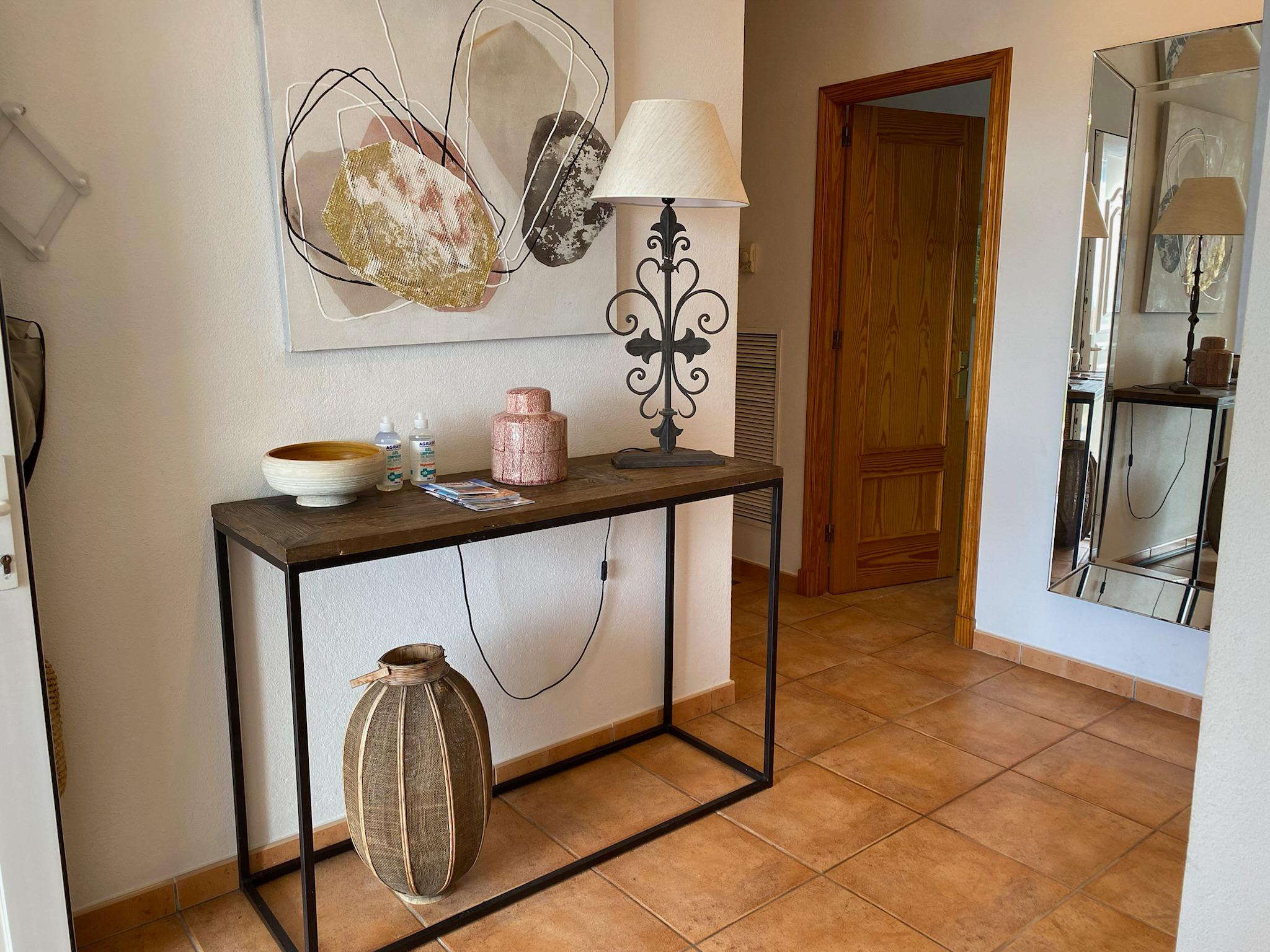 Al entrar en la villa, se accede a un amplio vestíbulo desde el que se pasa al salón, el comedor y la cocina, todos ellos diáfanos. La amplia zona de salón está separada del comedor y de la cocina, recientemente renovada, y cuenta con sofás, una mesa de centro y una gran chimenea. Hay un televisor inteligente para que pueda acceder a canales ingleses, Netflix, Amazon Prime, etc.