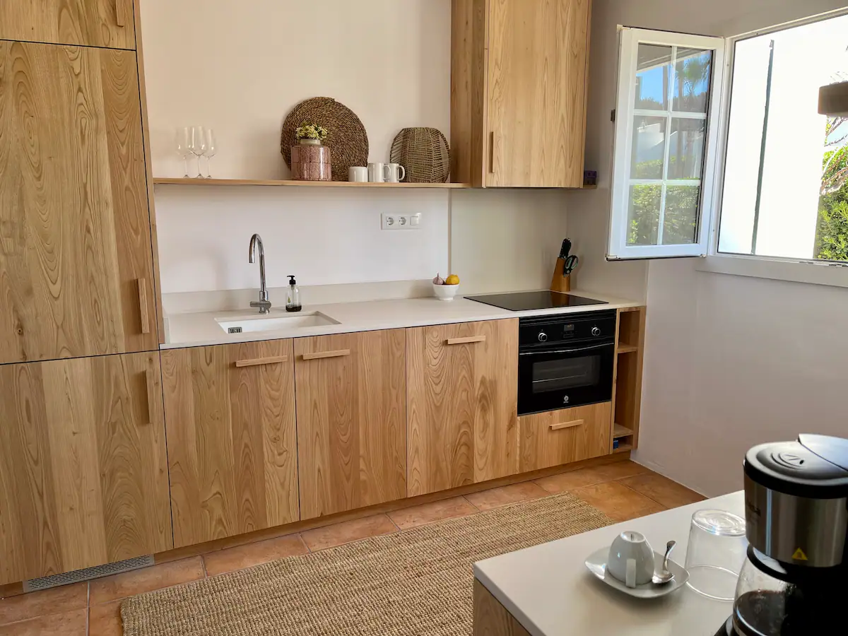 El comedor cuenta con una mesa y sillas, y puertas que dan acceso a la terraza. La cocina es abierta y dispone de lavavajillas, horno, placa eléctrica, microondas y frigorífico-congelador, además de toda la vajilla y cubertería que necesitará para unas vacaciones con cocina.