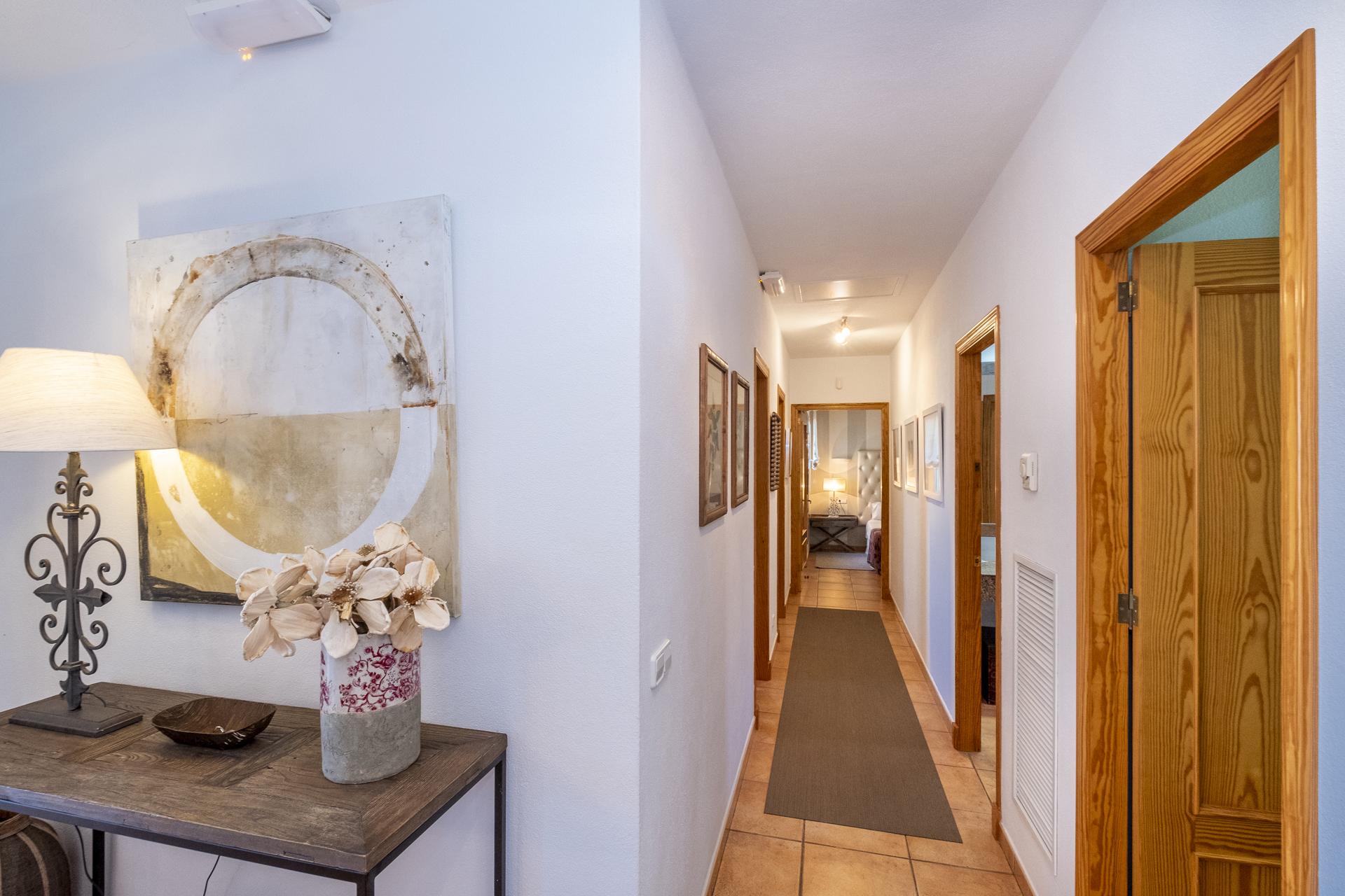 En entrant dans la villa, vous arrivez dans un hall d’entrée spacieux qui mène au salon, à la salle à manger et à la cuisine ouverts. Le grand salon est séparé de la salle à manger et de la cuisine récemment rénovée et dispose de canapés, d’une table basse et d’une grande cheminée. Il y a une Smart TV qui vous permet d’accéder aux chaînes anglaises, à Netflix, à Amazon Prime, etc.