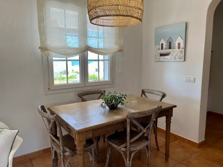 La salle à manger est équipée d’une table et de chaises, ainsi que de portes-fenêtres donnant sur la terrasse. La cuisine est ouverte et dispose d’un lave-vaisselle, d’un four, d’une plaque de cuisson électrique, d’un micro-ondes et d’un réfrigérateur-congélateur, ainsi que de toute la vaisselle et les couverts dont vous aurez besoin pour des vacances en toute autonomie.