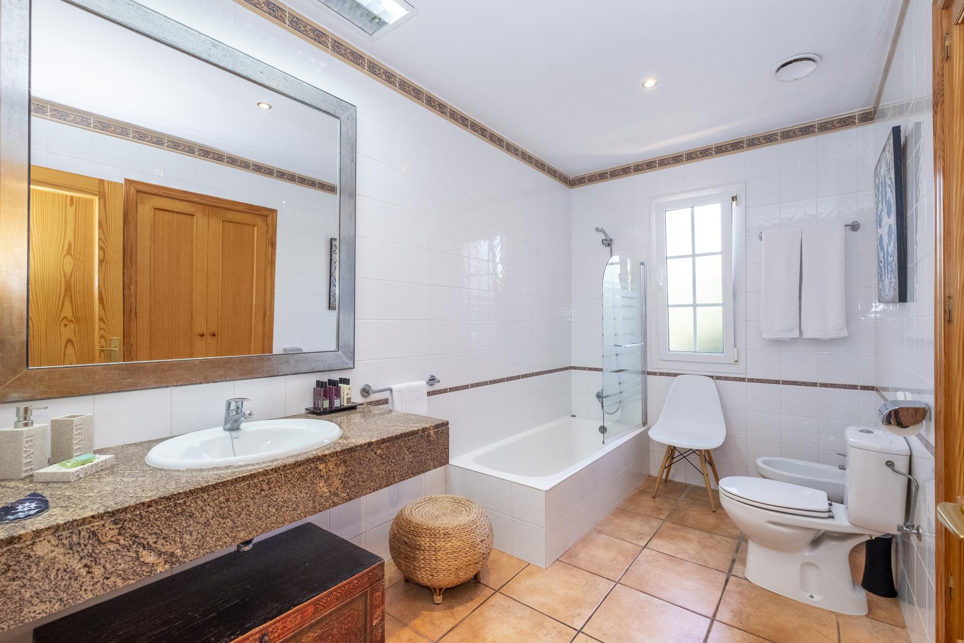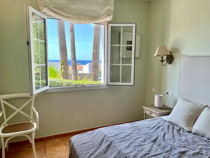 La chambre principale avec lit double queen size dispose de sa propre salle de bains avec meuble-lavabo, douche et WC. La suite principale offre une vue magnifique sur la mer, dispose de nombreux espaces de rangement et est climatisée.