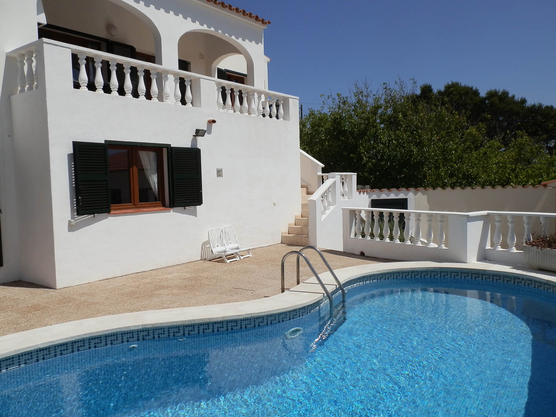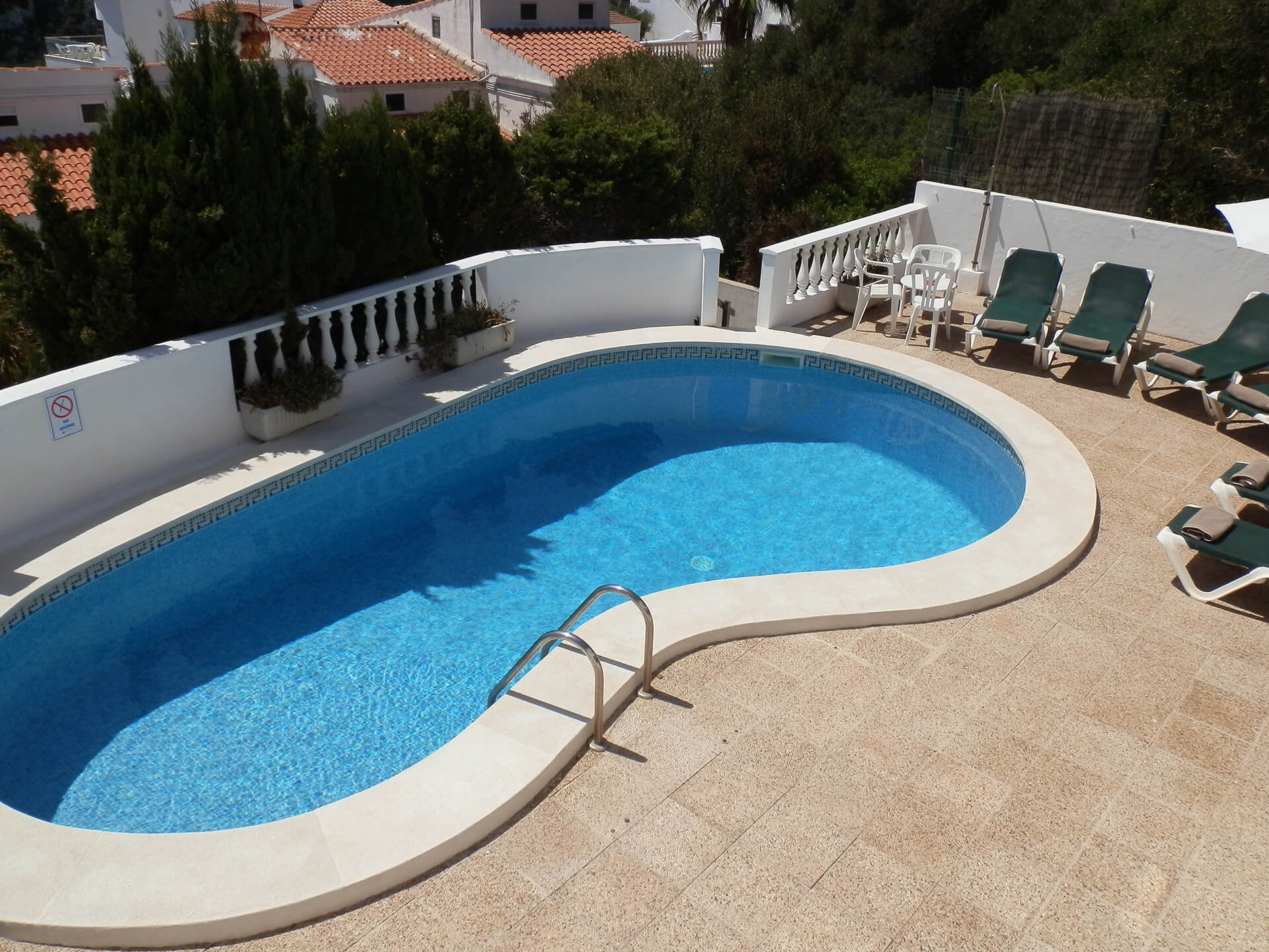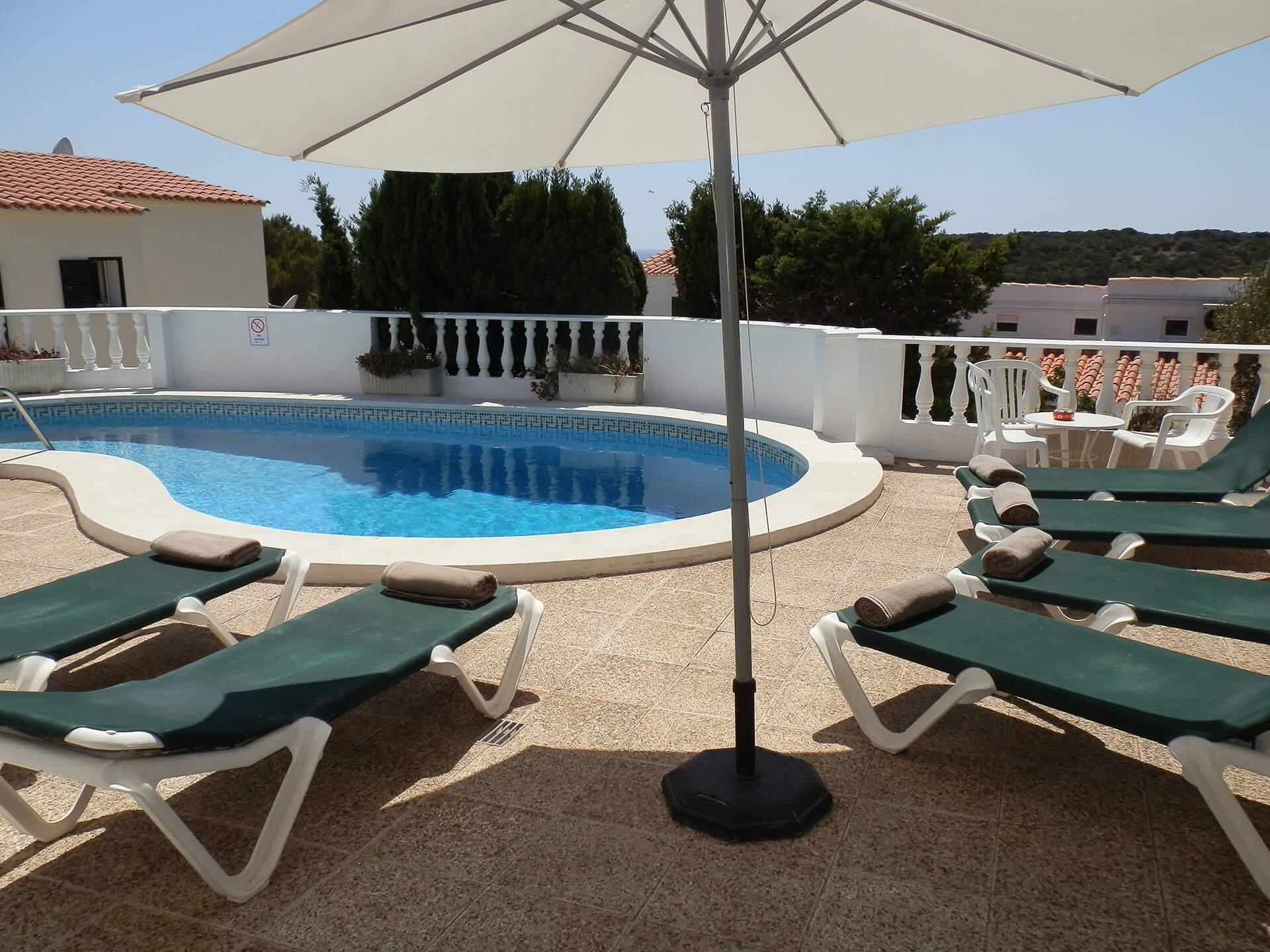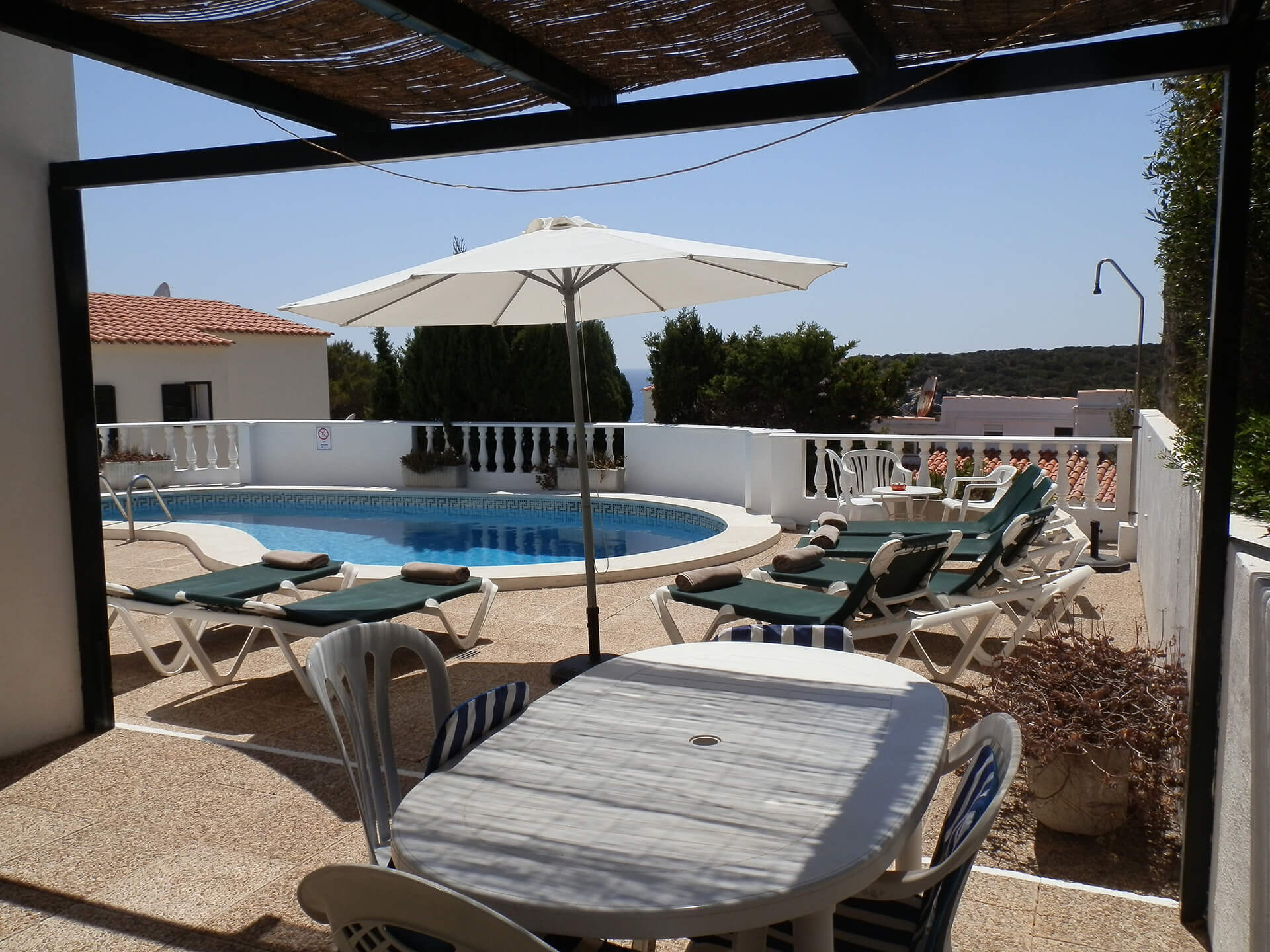 Les portes fenêtres du salon donnent sur une terrasse avec une vue superbe. Quelques marches vous amène à la piscine de 10×5 mètres et à une autre terrasse d’où prendre le soleil. Nous pouvons rajouter une protection enfant à la piscine (en extra).