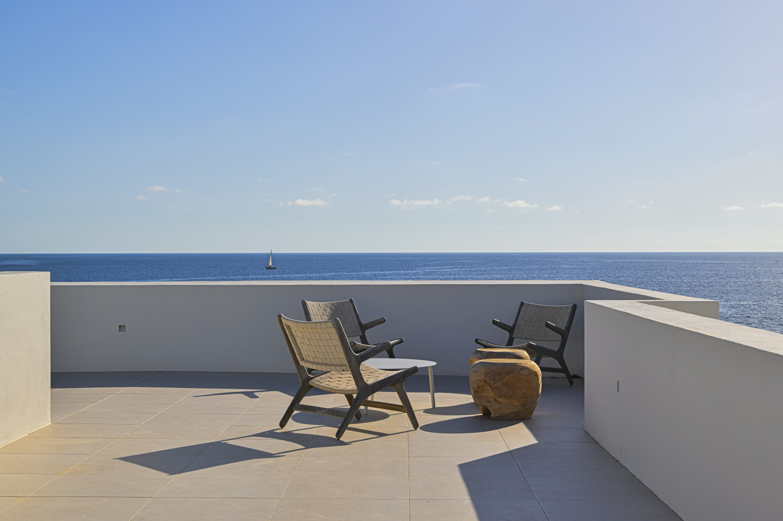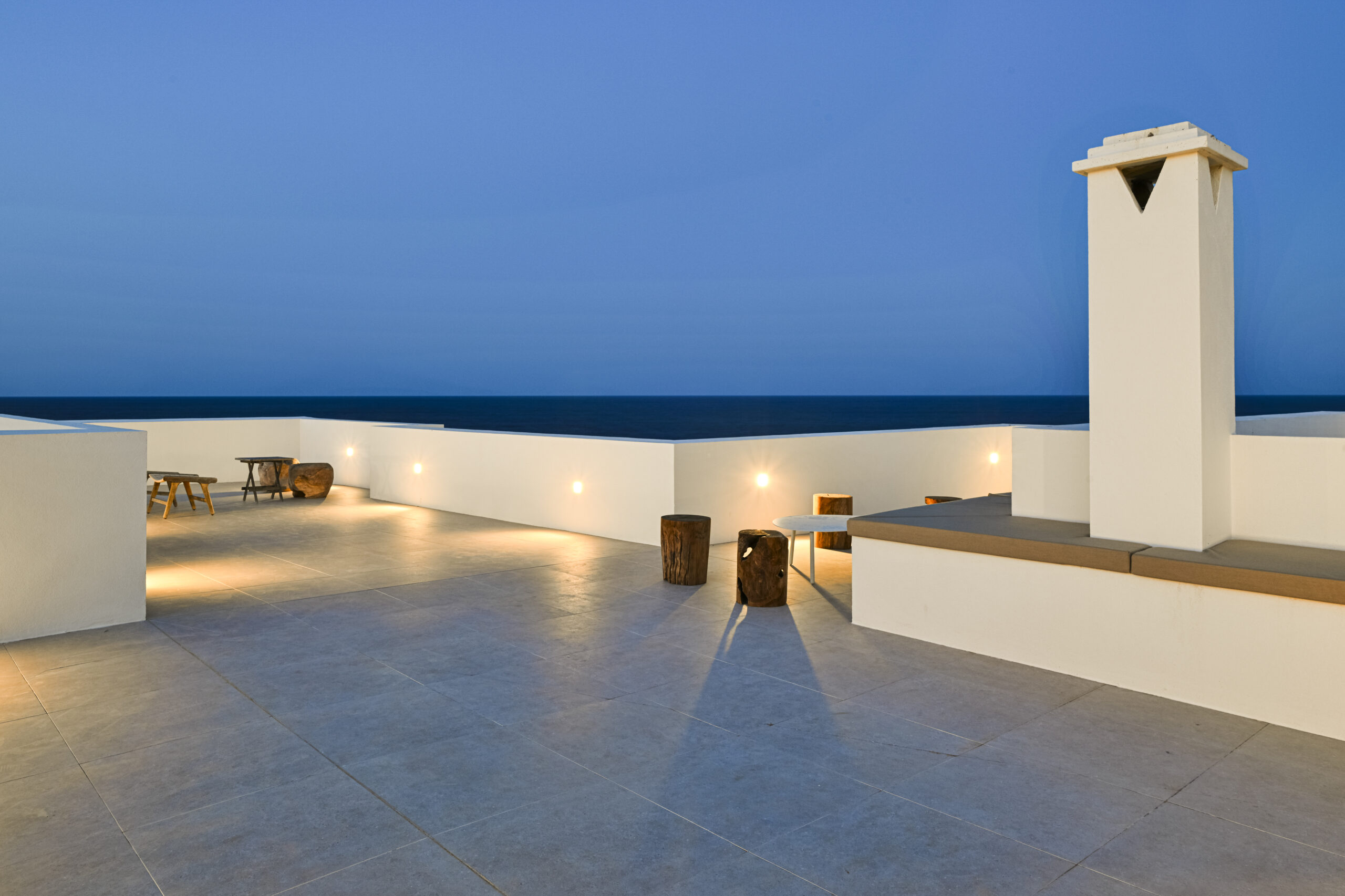 From the lounge is a large glazed terrace with comfortable seating areas to take in the sea views. There is also a large courtyard to the rear of the lounge with added seating areas to chill out. From this courtyard you have some steps that take you up to a magical roof terrace. This terrace covers the whole area of the house and here you will get some of the most stunning sea views possible as well watching the sunrise in spectacular style. The huge roof terrace is beautifully designed and has table and chairs in different areas allowing views across the Med.