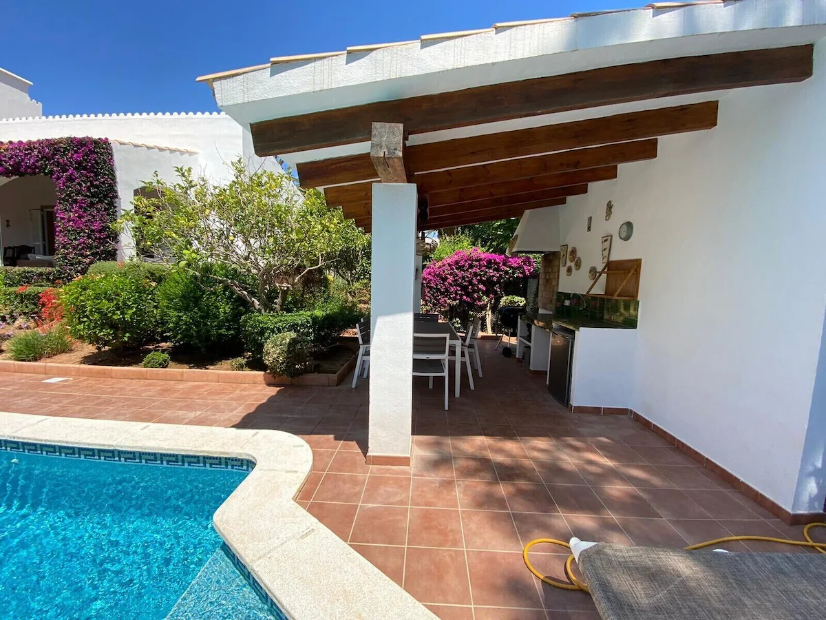 À l’extérieur de la propriété se trouve une grande terrasse couverte, accessible depuis les deux chambres du rez-de-chaussée, le salon et la cuisine, à laquelle on accède par des portes-fenêtres, ce qui permet d’avoir de l’ombre toute la journée. Sous la terrasse, une table et des chaises peuvent accueillir 6 personnes pour des repas en plein air. Il y a également deux canapés confortables pour se détendre et profiter des jardins de la villa.