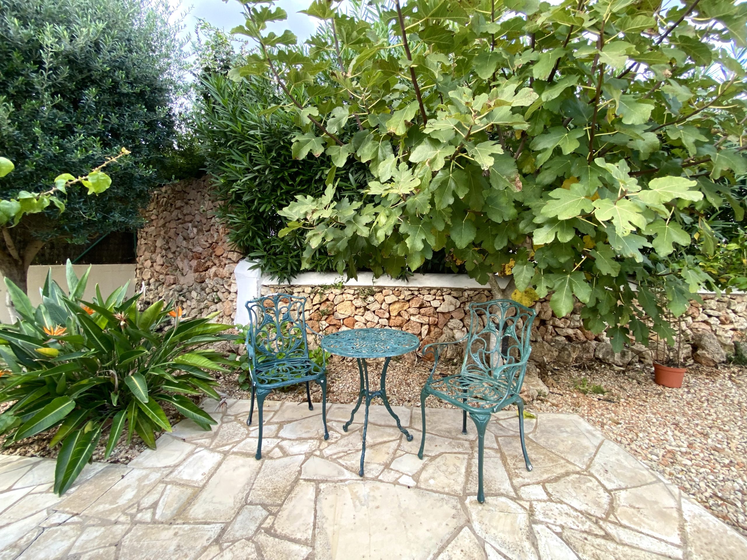 The villa boasts different outside areas where you can relax, dine, enjoy the sun or find a shady spot. Firstly, there is the main pool terrace, at the front of the house, and overlooking Addaia’s scenic harbour boasting a 8×4 swimming pool. Here you will find sunbeds, a dining table that seats up to eight people, and a seating area with a coffee table. There is a large gas barbecue, perfect for summer al fresco dining. To the rear of the house, in addition to the second outdoor dining area, there is a small rock garden with a table and chairs surrounded by trees and bougainvillea; the perfect place for some peace and quiet.