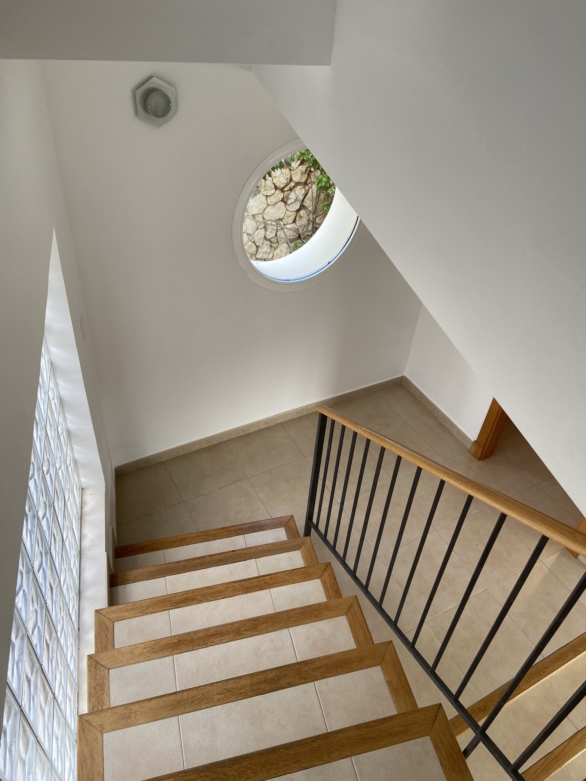 On the other side of the dining/living area, there is a set of glass doors that lead off to a small, shady outdoor dining area, with a table that seats 8. There is also a WC at the bottom of the stairs.