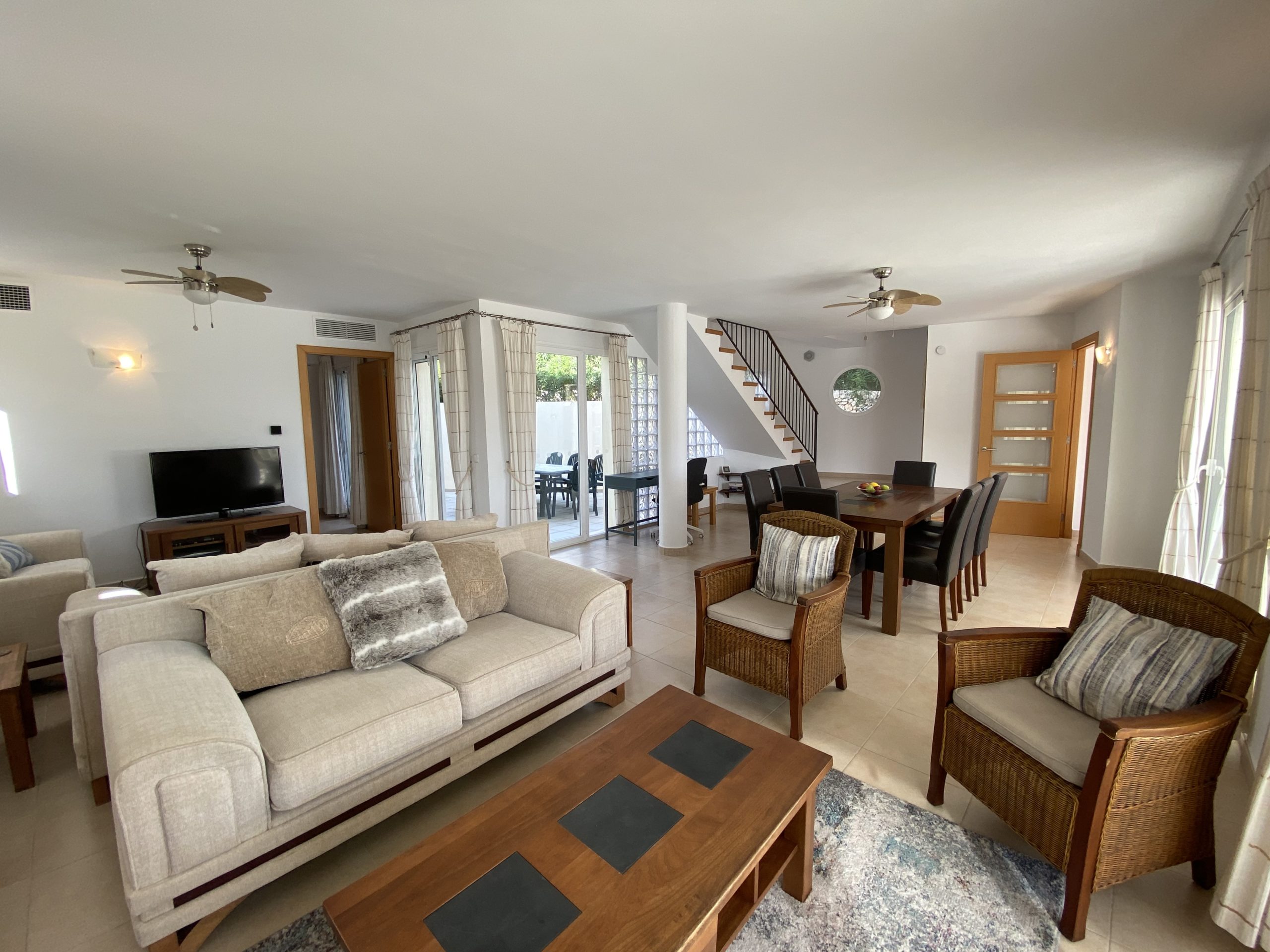 To the left from the entrance hall is the open plan dining/living area which has two sets of French doors that lead out onto the pool terrace, letting in lots of natural light and offering great views over the pool and the Addaia harbour. The large dining room table seats up to eight people. The living area is divided into two seating areas: one facing the pool with a sofa, two chairs and a coffee table; while the other is in the far corner of the room, with two sofas facing a flat-screen TV. The TV is connected to a satellite dish and a Sky-box and there is also a DVD player. The dining/living area has ceiling fans and built-in air conditioning.