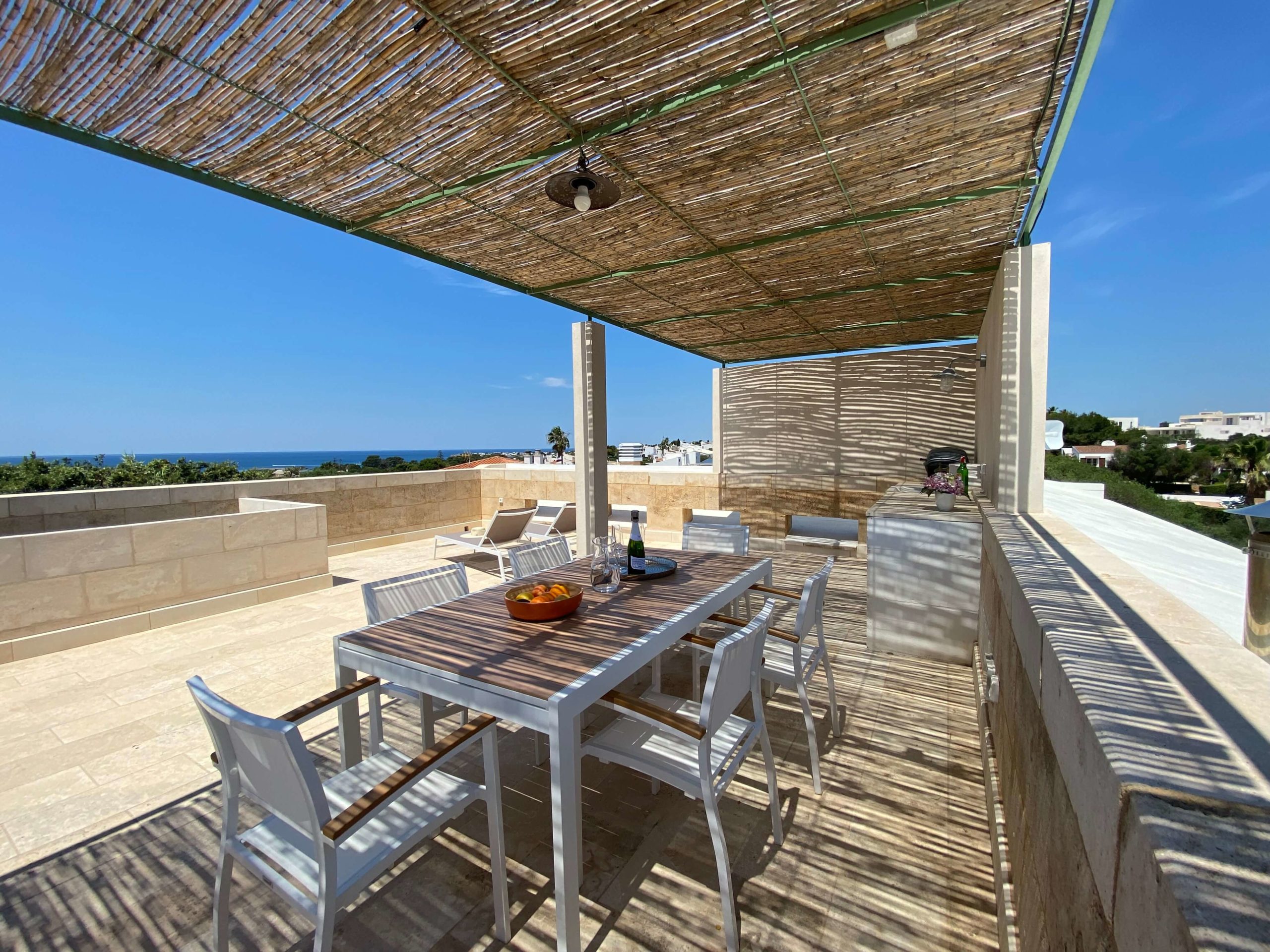 There are also steps leading up to a roof terrace with stunning sea views and an outside kitchen and dining table.