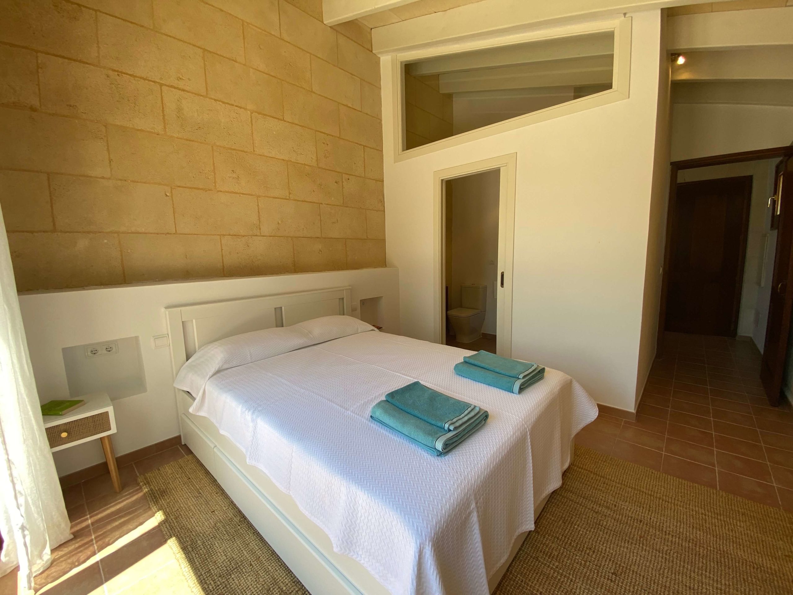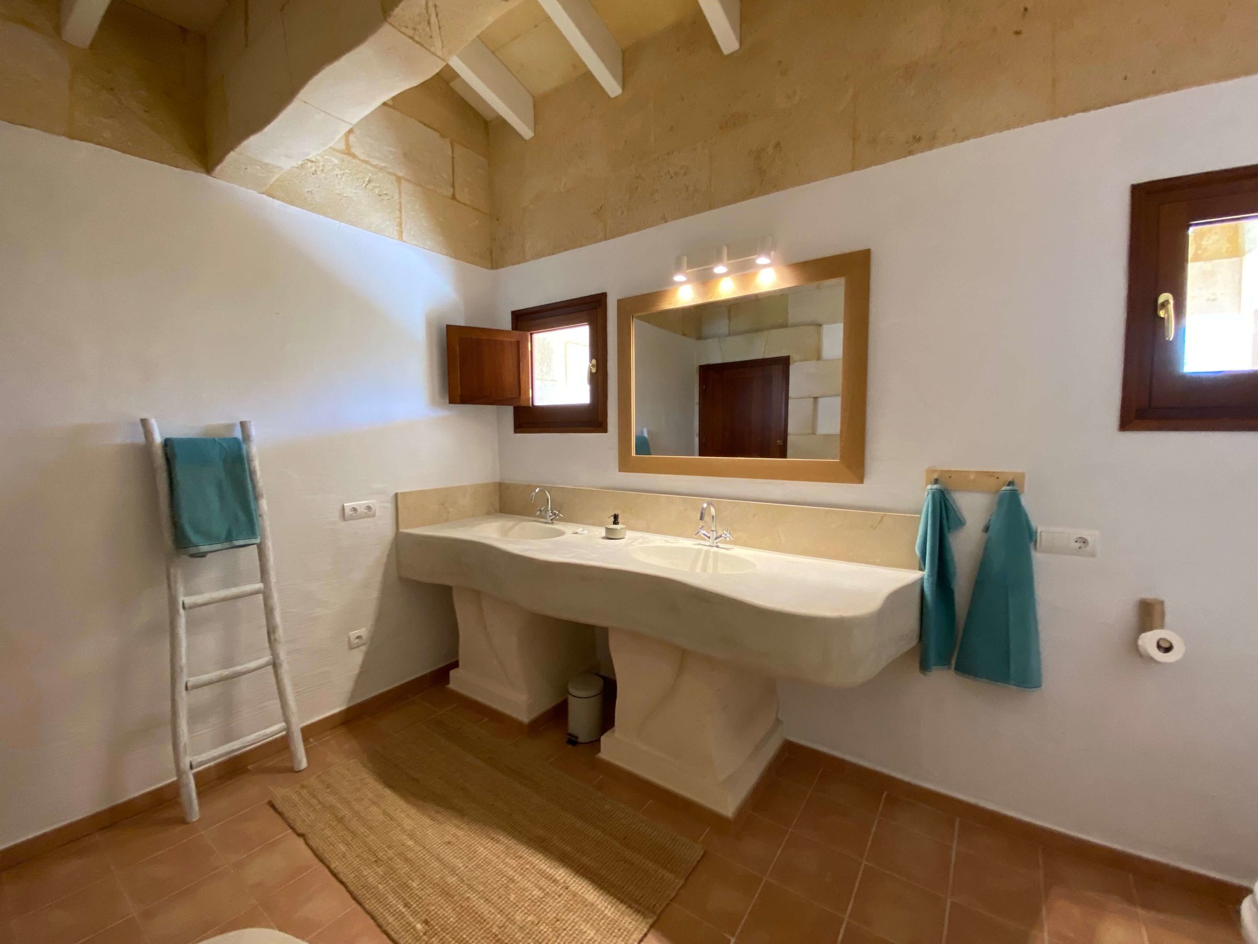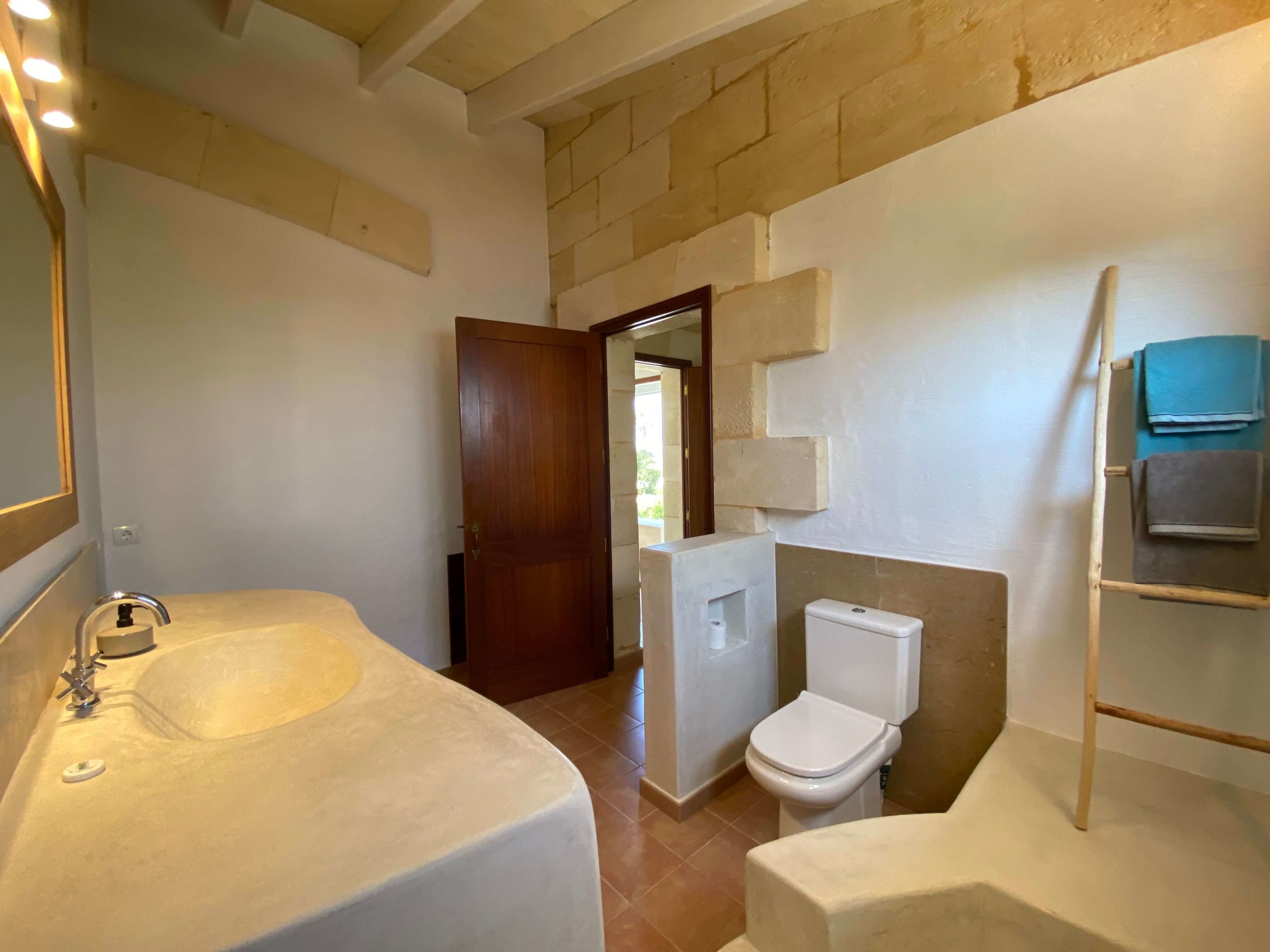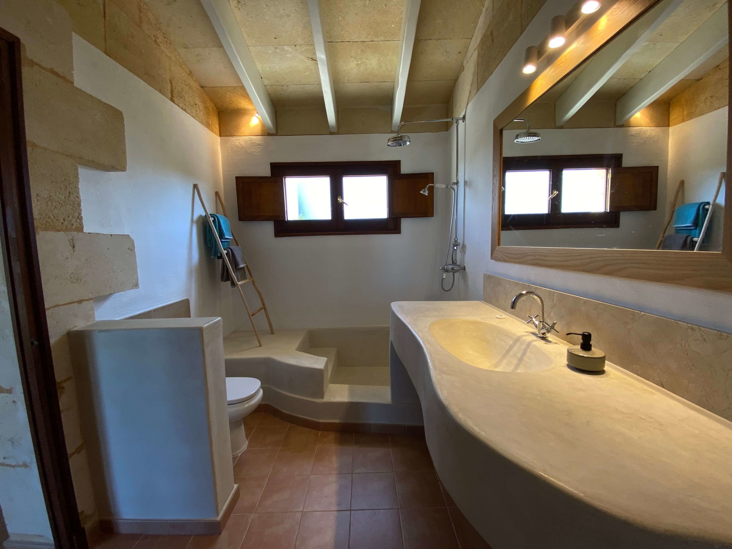 The Master suite with double bed is entered through a spacious dressing room and has a unique modern handmade bathroom which is in keeping with the traditional Menorcan style. This en-suite has a vanity unit, shower and WC. The Master suite has lovely sea views.