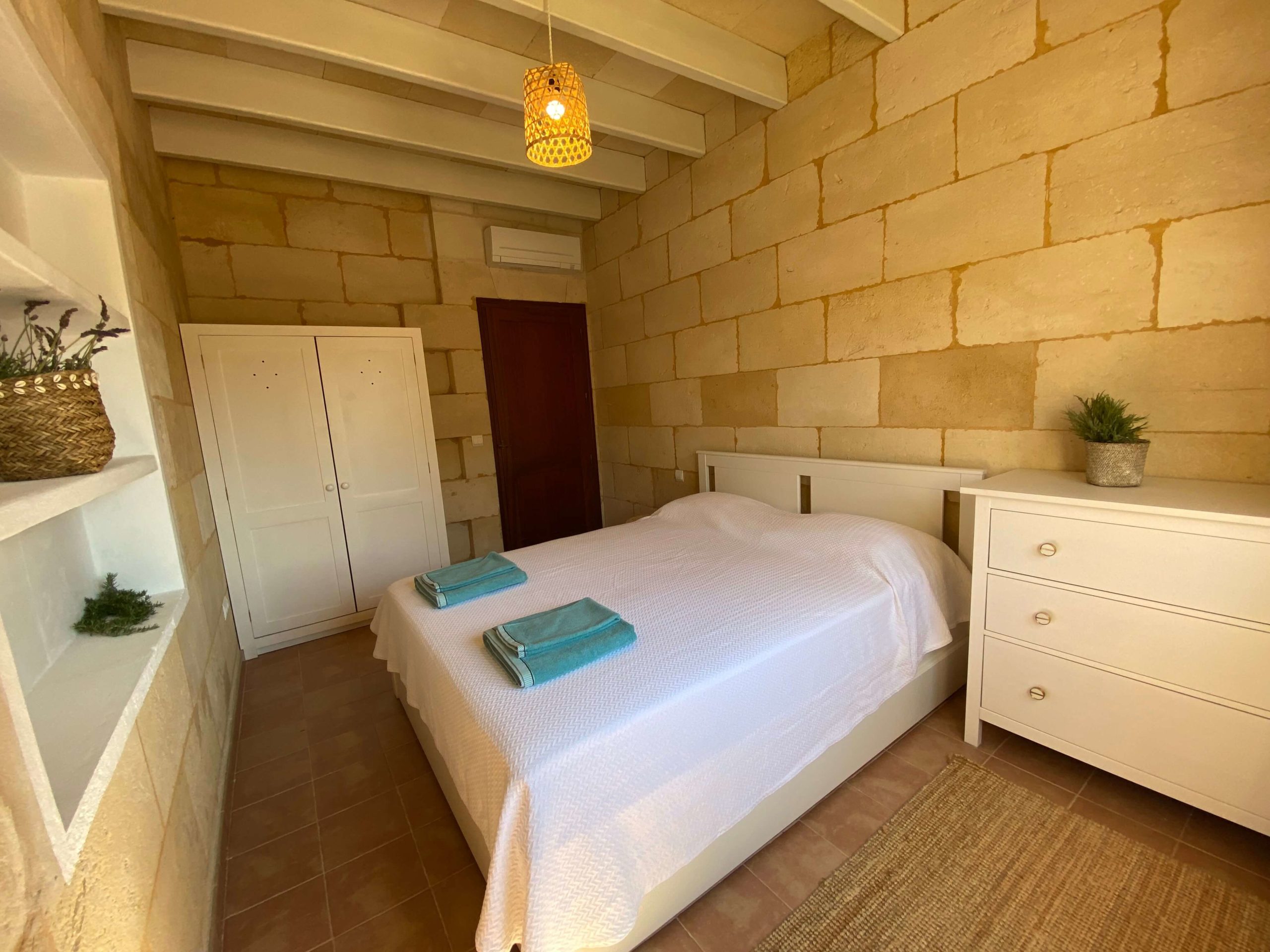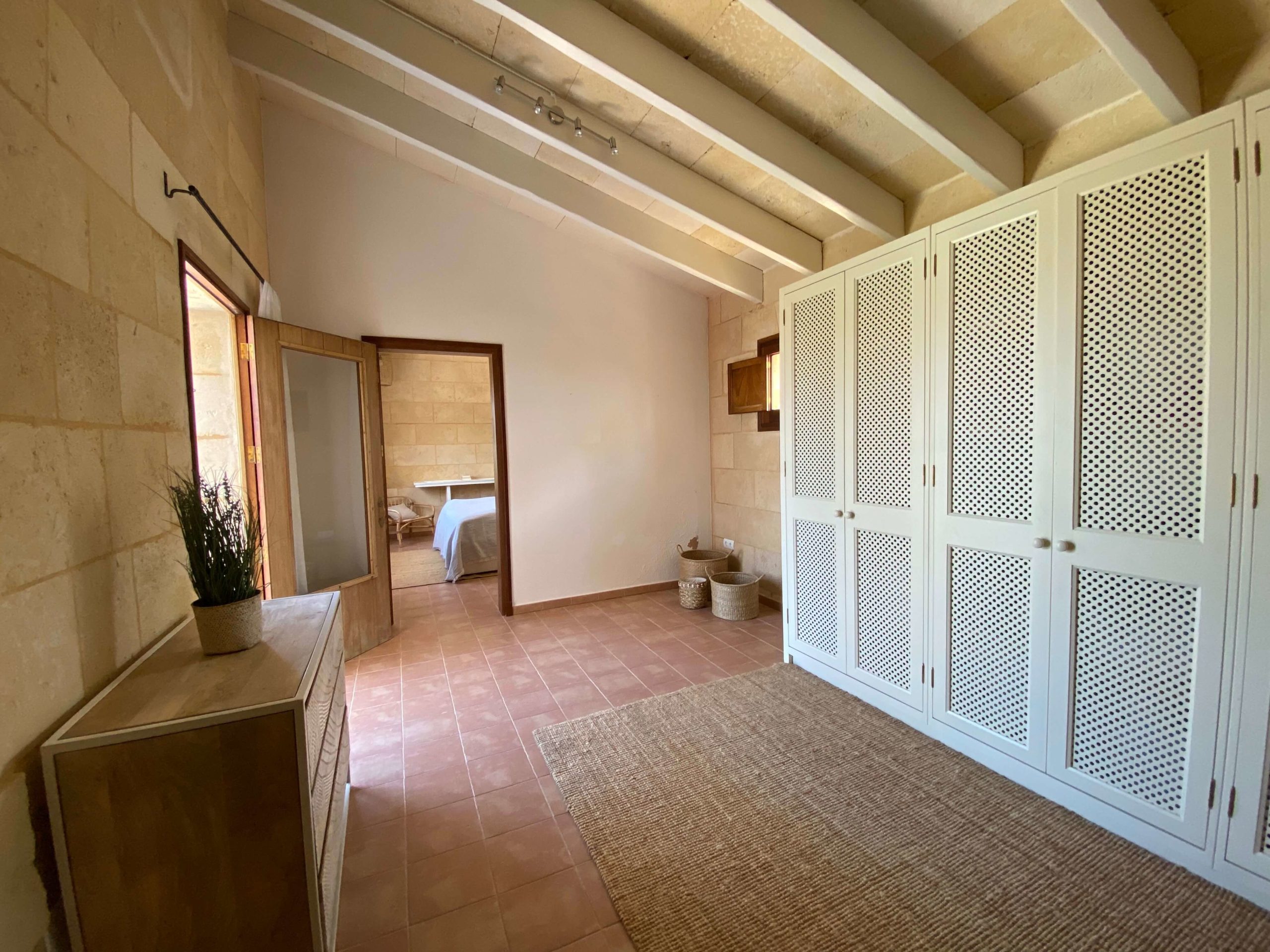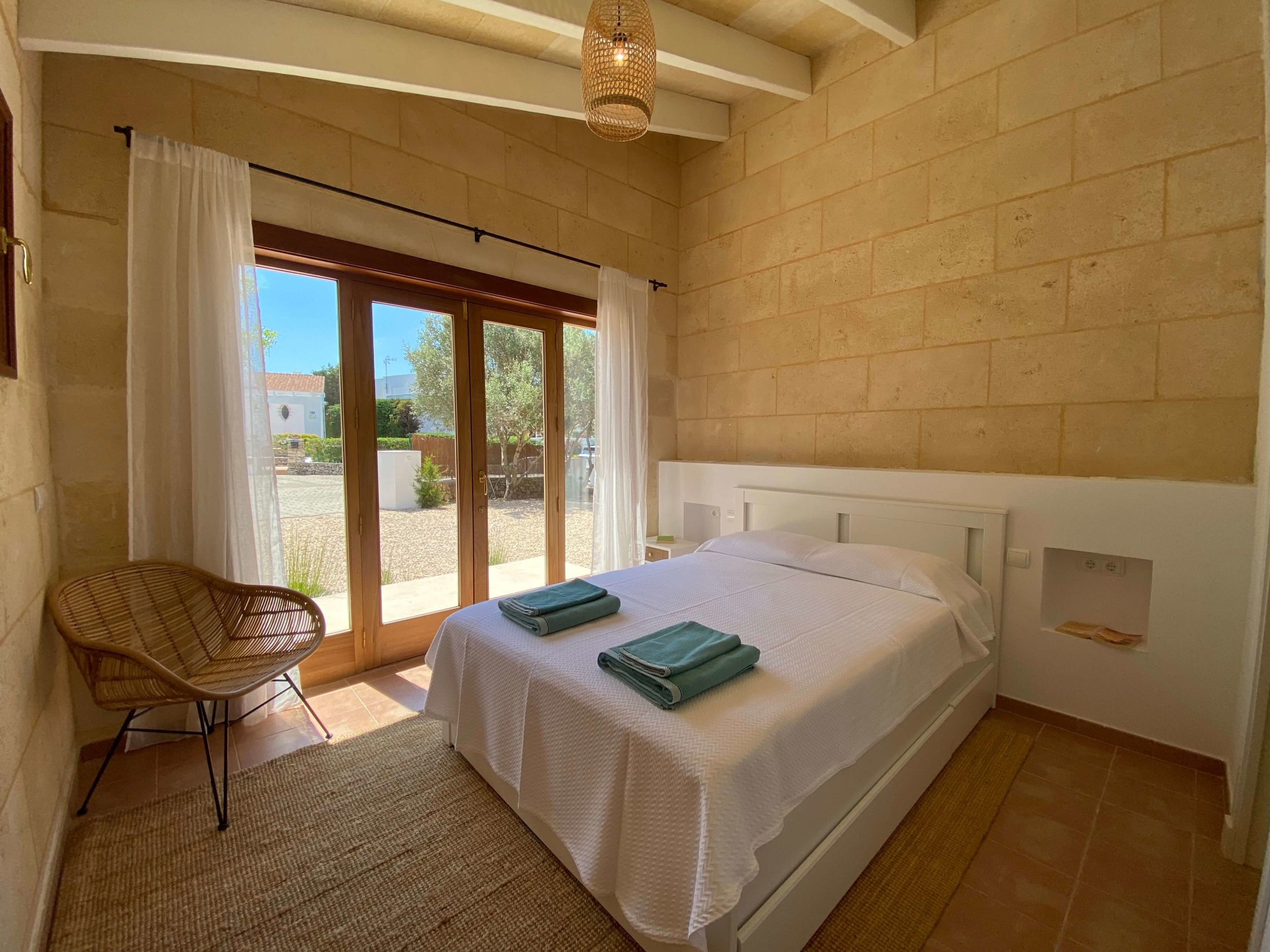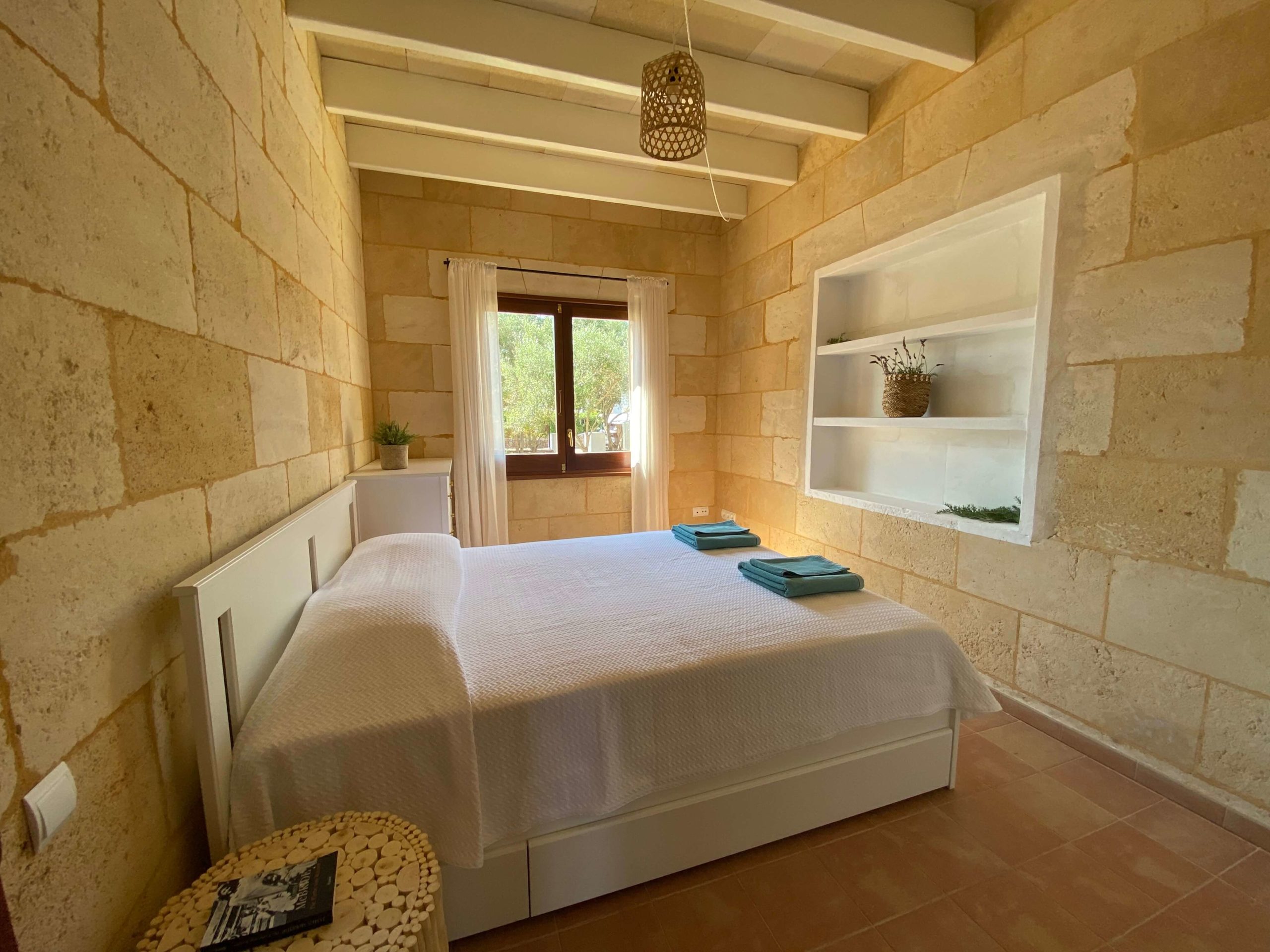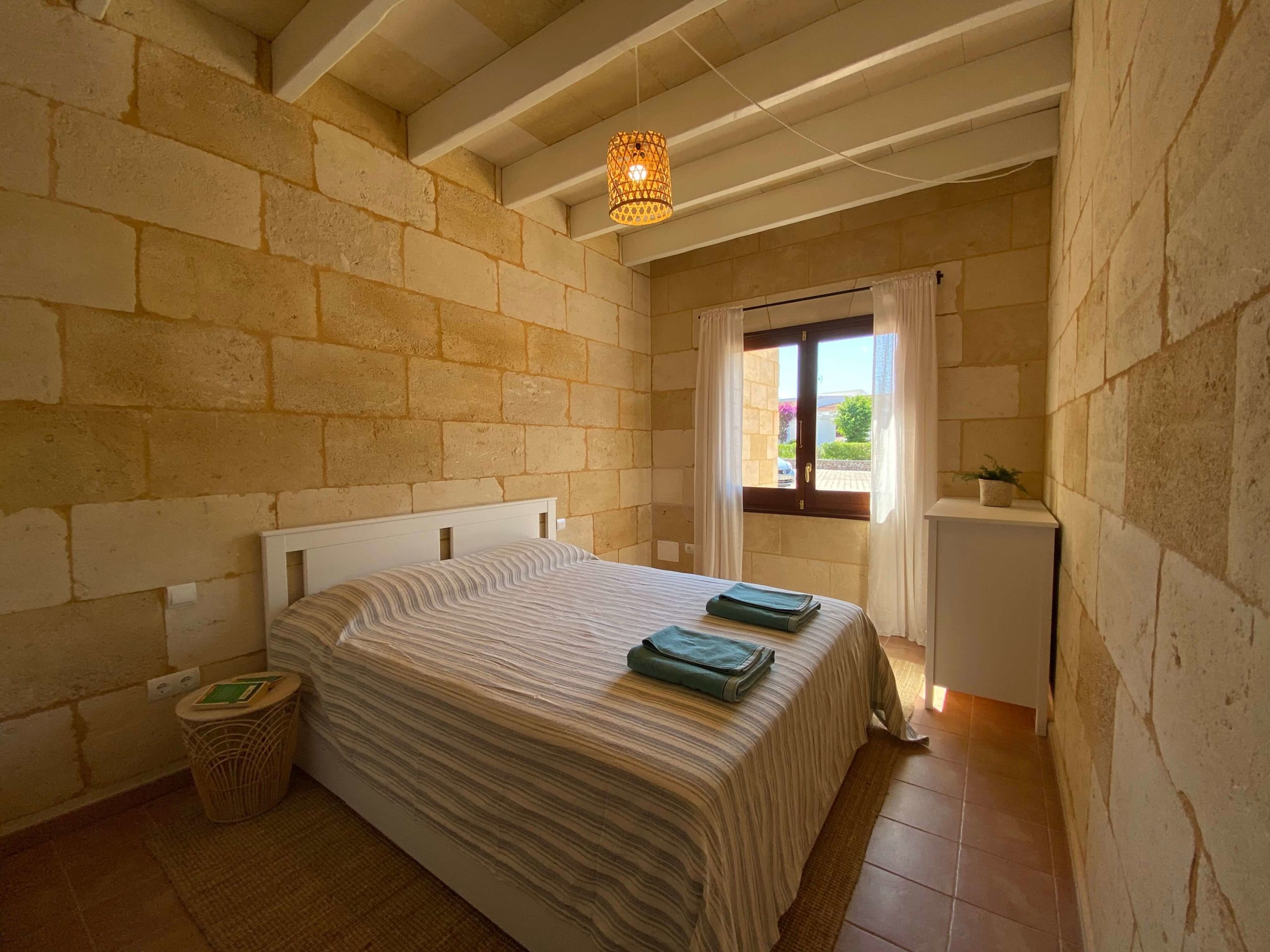 The Master suite with double bed is entered through a spacious dressing room and has a unique modern handmade bathroom which is in keeping with the traditional Menorcan style. This en-suite has a vanity unit, shower and WC. The Master suite has lovely sea views.