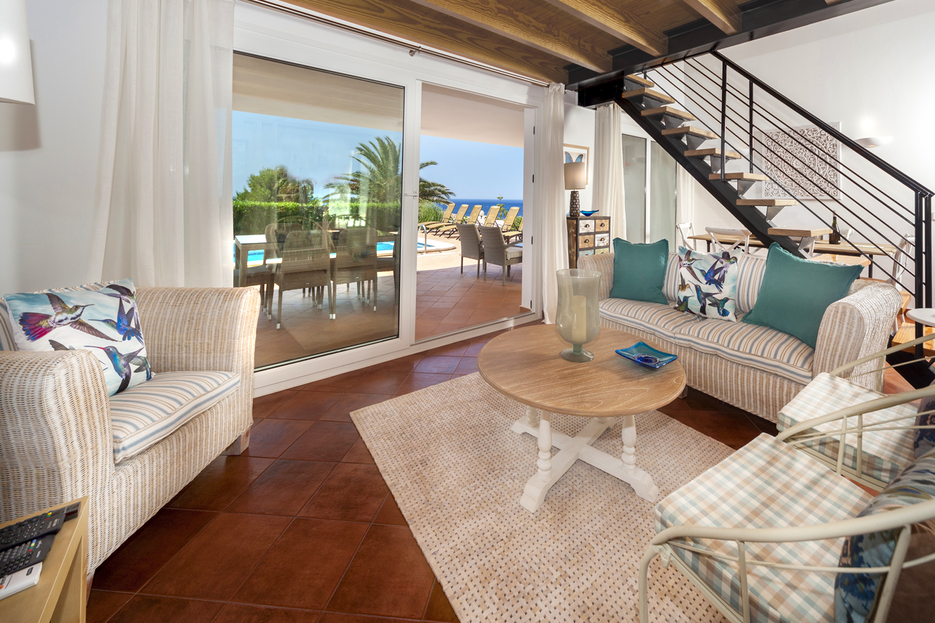 Villa Atalaya is a stylish, modern 3 bedroom villa in the Atalaya area of Binibeca on the South East coast of the island. The villa has 2 double bedrooms with fitted wardrobes and sea-views, 1 large twin room with two single beds, 2 bathrooms (one ensuite with a bath, and one with a shower), a large living & dining room with amazing sea views and access to the main stunning terrace and English style courtyard, and fully equipped large kitchen with a breakfast corner and laundry area. The villa includes a cosy loft/relaxing room upstairs with wooden floors, which may be accessed from the living room, providing access to the very large sun terrace, with breathtaking sea views.