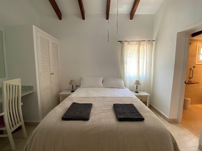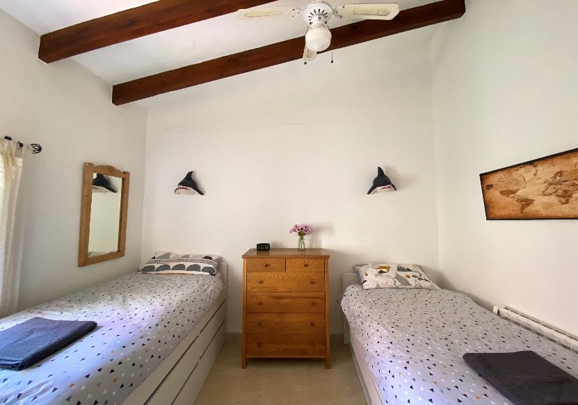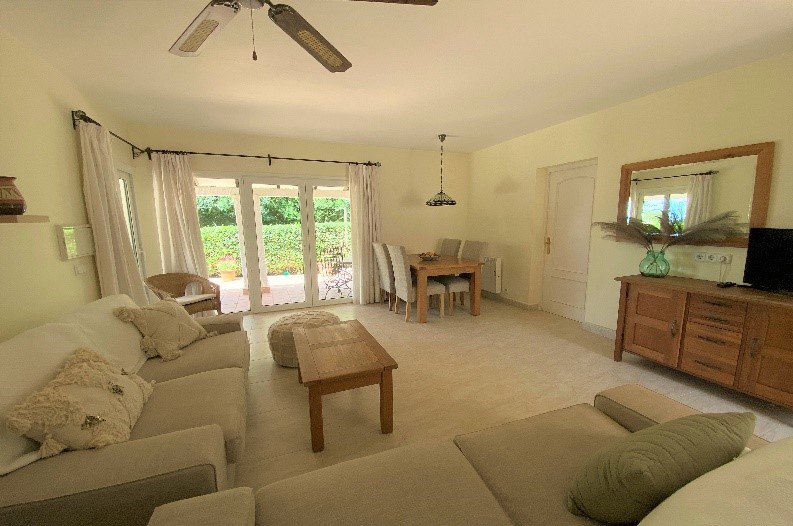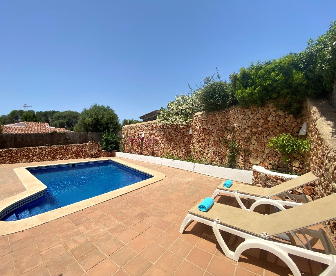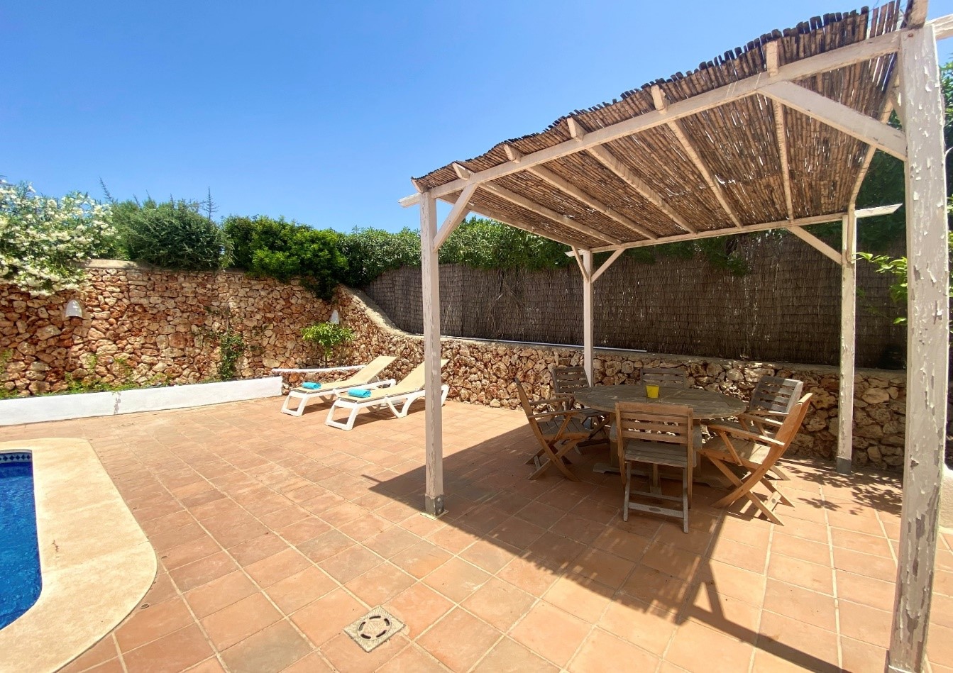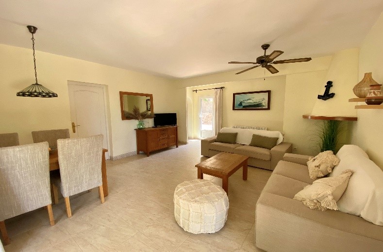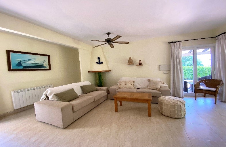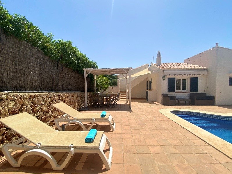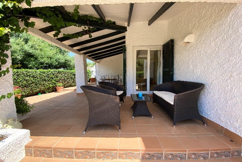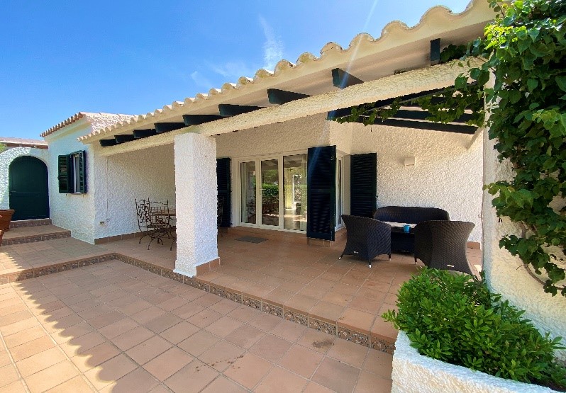 This lovely, spacious 3 bedroom family villa, built on one level is located in the hugely popular Binibeca Nou area on Menorca’s pretty South East coast. On entering the villa through the privately gated courtyard and covered porch area, you enter into a large living/dining area which is fully furnished with comfy sofas, coffee table and dining table for 6 people. The living room is equipped with a TV with IPTV channels, DVD player, and Wi-Fi Internet access.