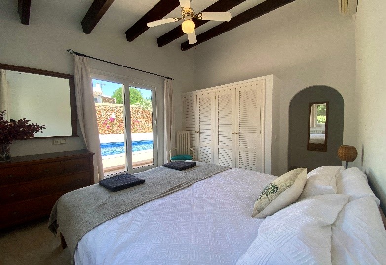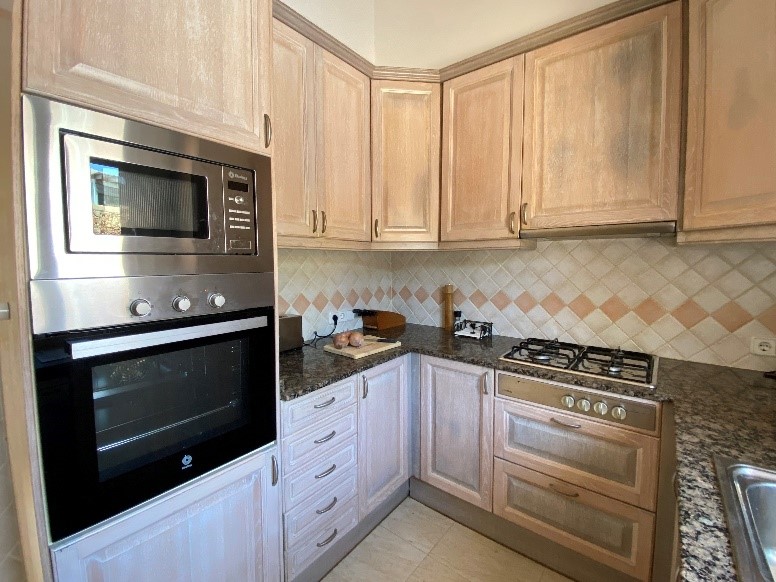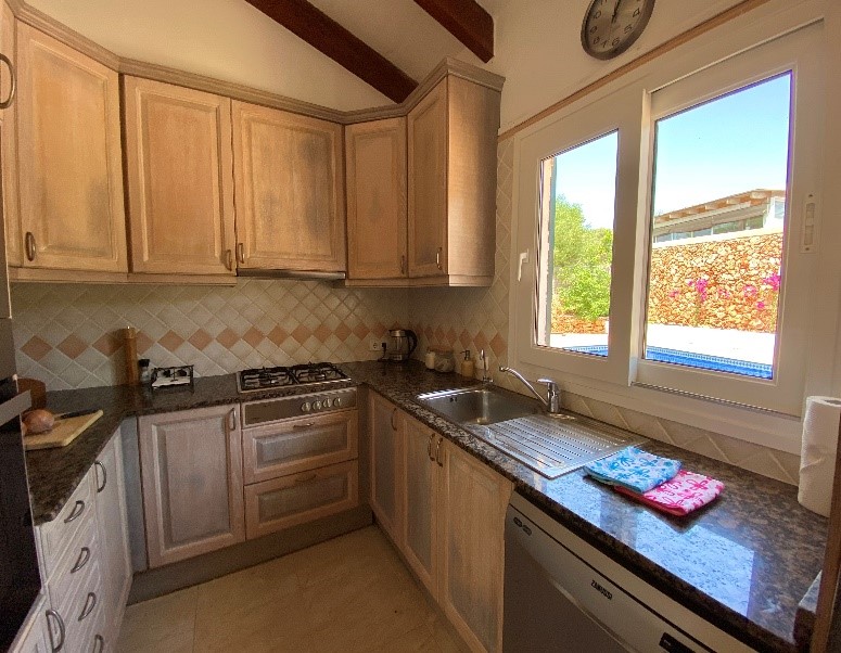 From the living room on the left hand side leads to the Master Bedroom with King Size Bed, Fitted Wardrobes and has an En-Suite bathroom and direct access to the pool area. On the other side of the lounge directly in front of the front door, there is another door that also leads to the pool area. Just before the door to the pool area, on the left hand side there is an archway that leads to a fully fitted kitchen which is bright and spacious and well supplied with an oven, hob, fridge/freezer, microwave, dishwasher and all the utensils and crockery necessary for a self-catering holiday.