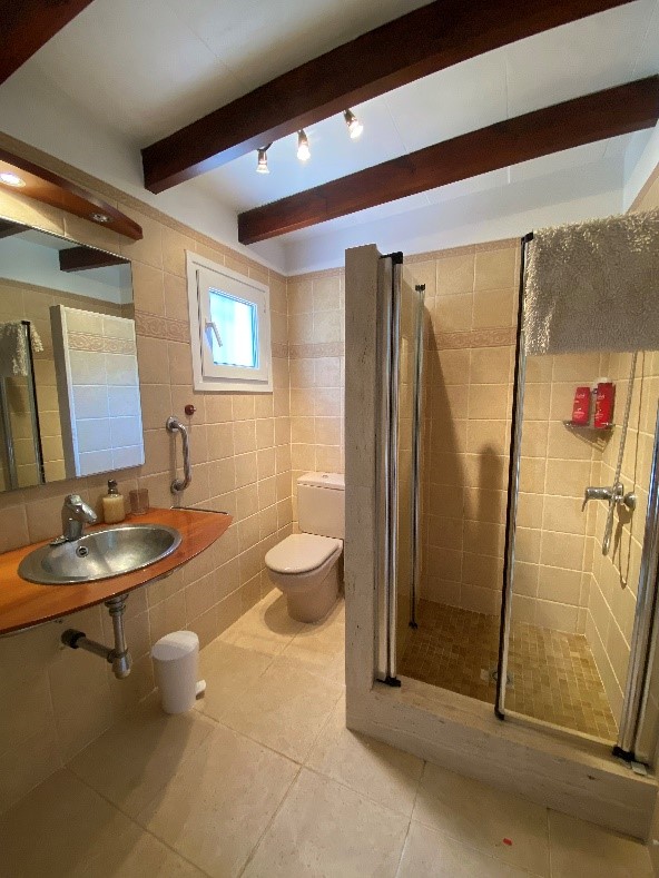 On the right hand side of the door to the pool area is a small hallway that leads to a Double Bedroom with King Size bed and this too has its own En-Suite bathroom. Opposite this is a twin bedroom and on the right hand side and a bathroom at the end of the hallway. As you come out of the door to the pool area, there are stairs that lead to the roof terrace. By the pool terrace there is a covered area with a dining table and chairs, a 2 seater sofa, chair and small table (all rattan) and sunbeds.