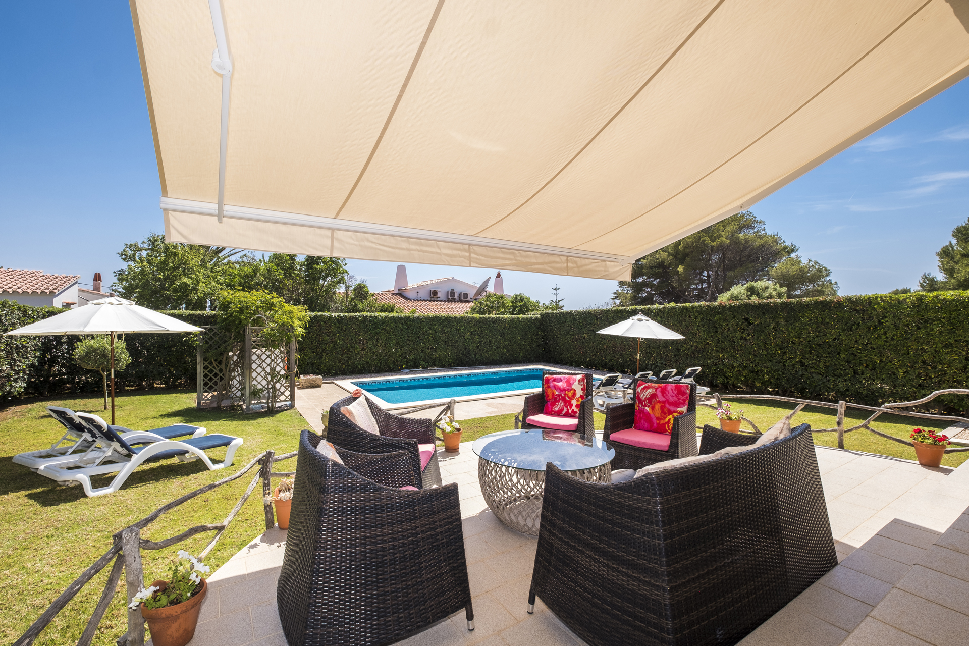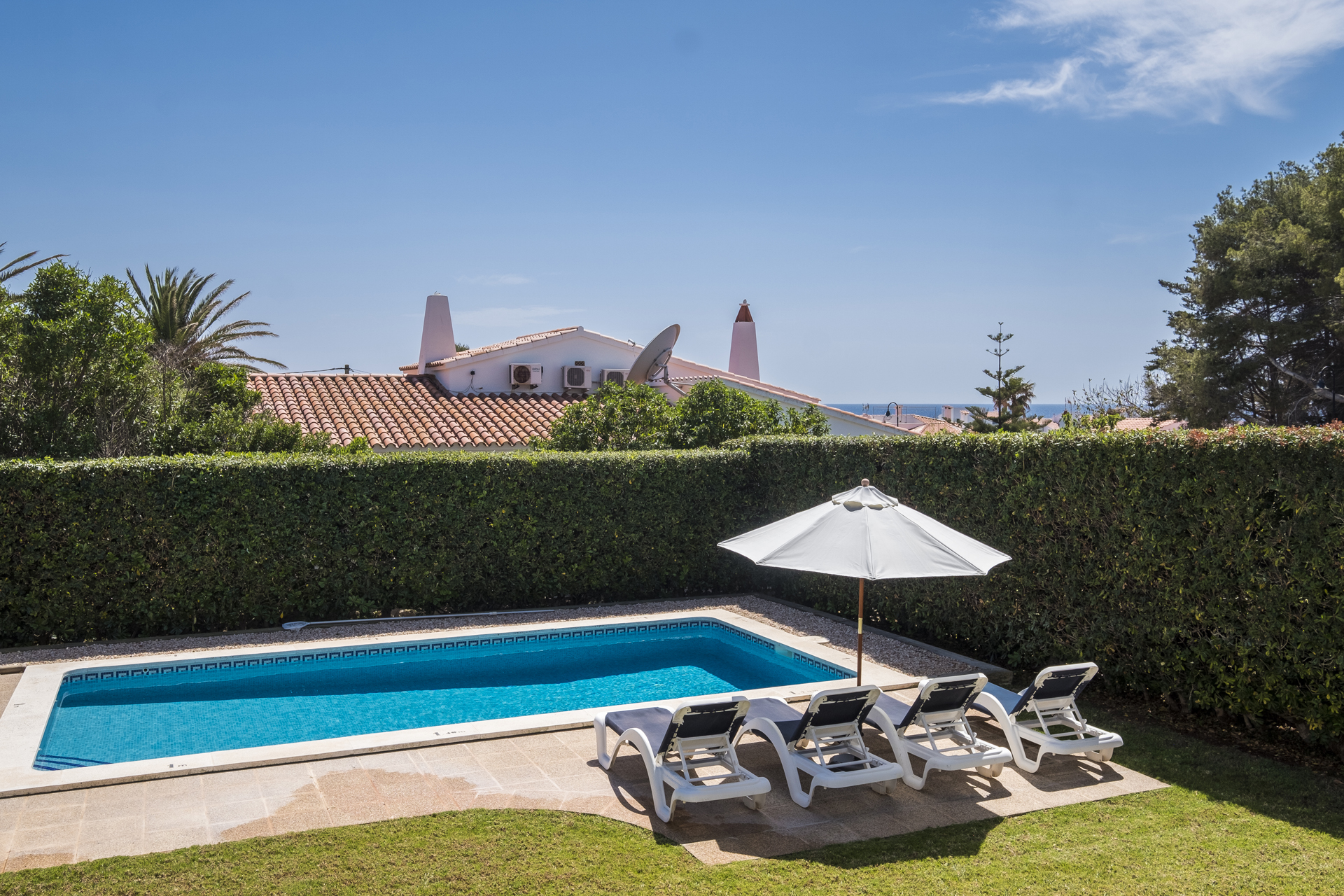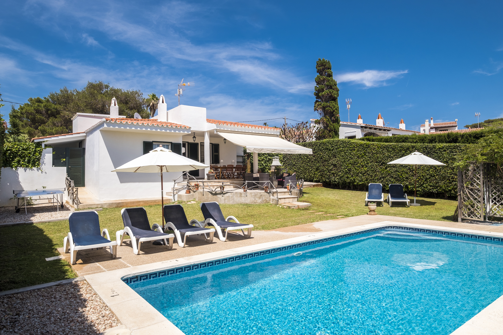 Terrace and garden equipment: Built-in barbecue. Extendable dining table for 10 people. 10 chairs. Sofa, 4 armchairs and side table. 10 reclining sun loungers. 2 umbrellas. Double relax bed with cover. Ping-pong table.