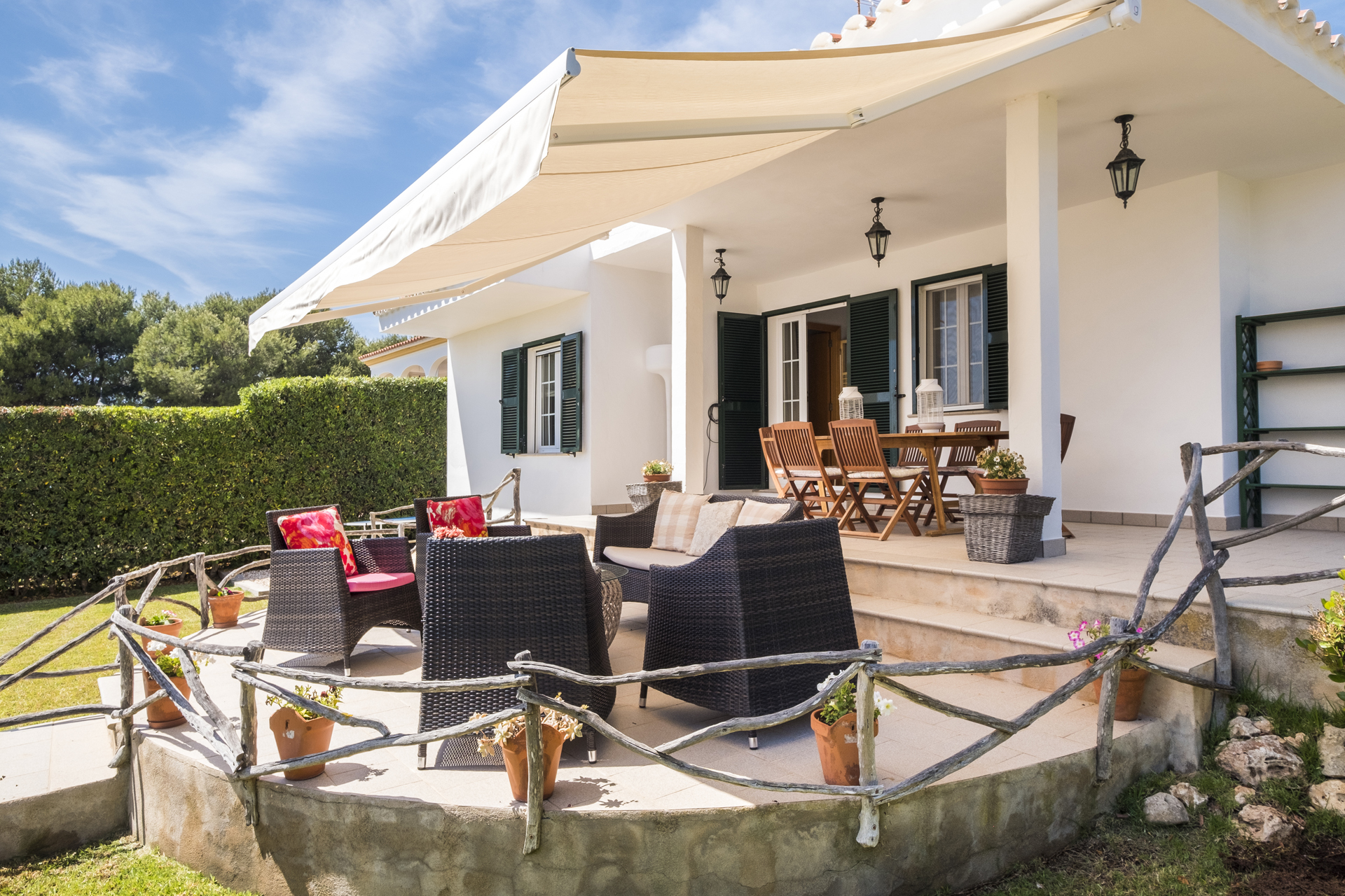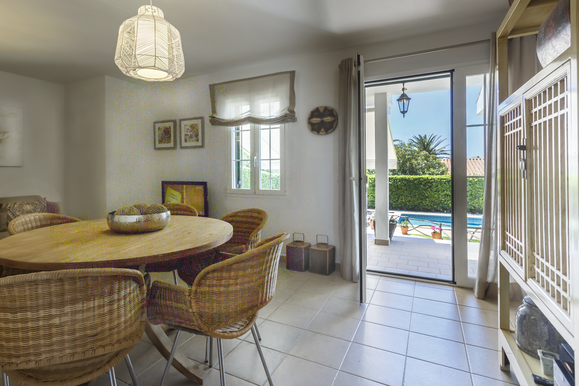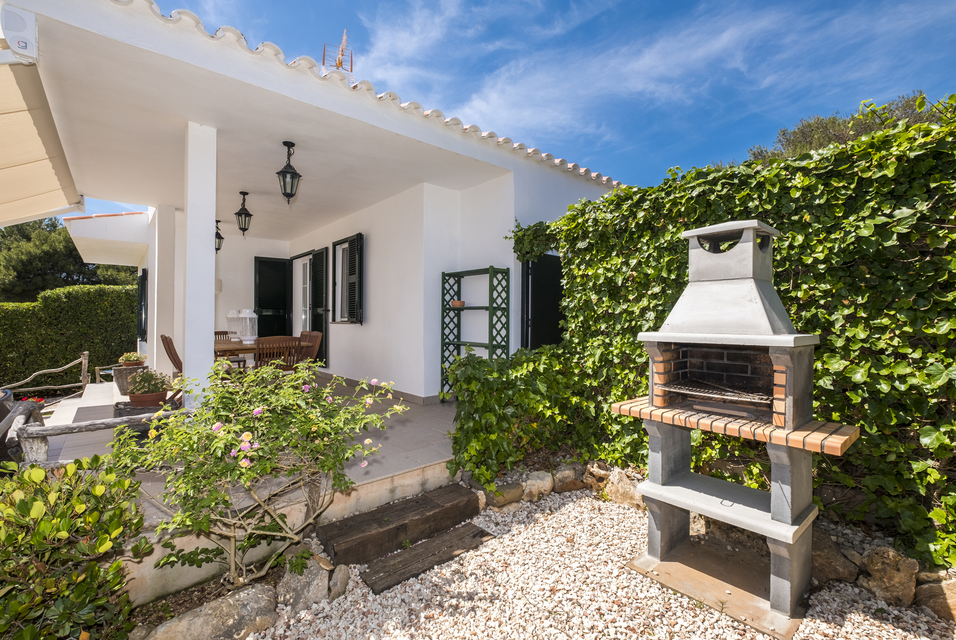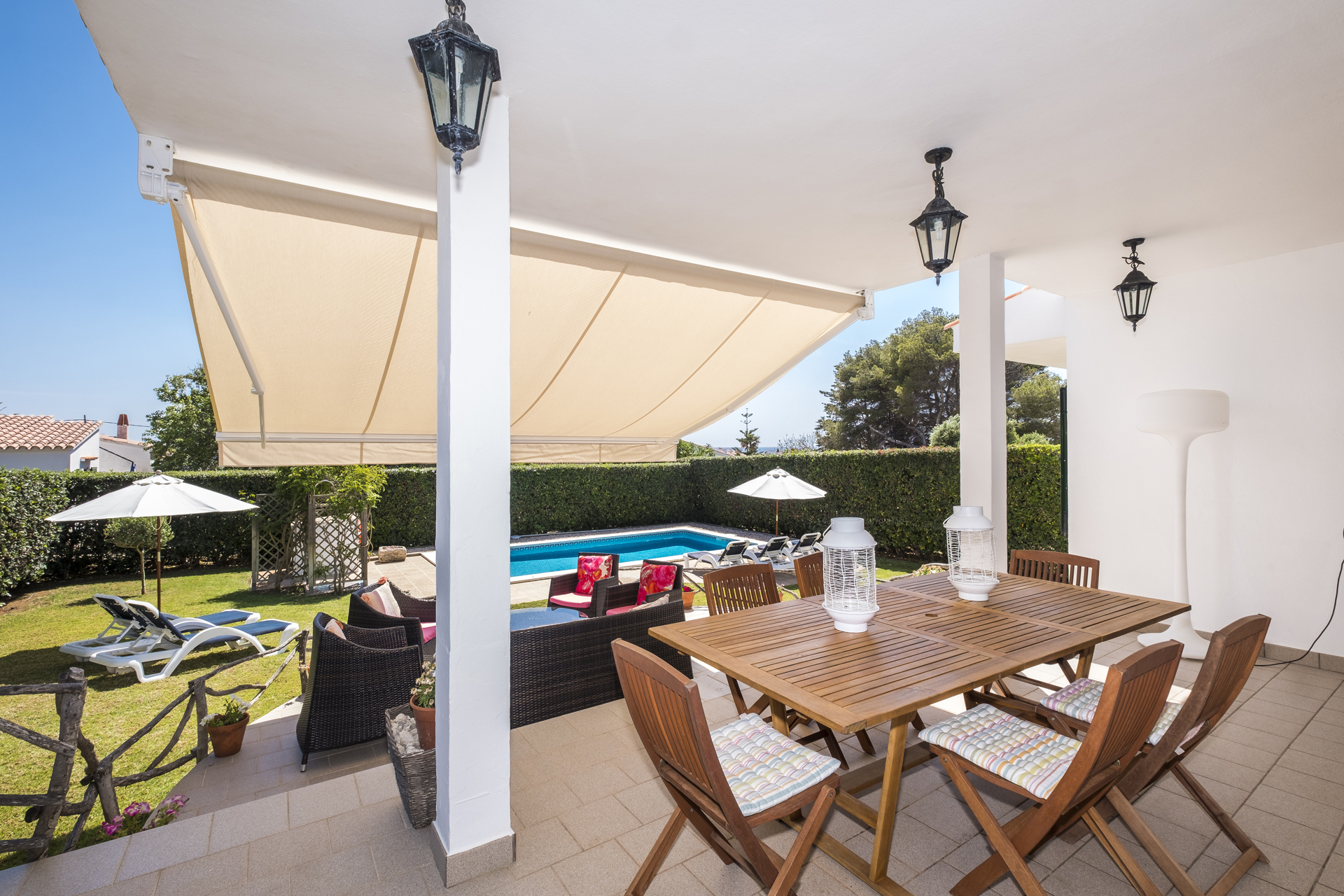 Terrace and garden equipment: Built-in barbecue. Extendable dining table for 10 people. 10 chairs. Sofa, 4 armchairs and side table. 10 reclining sun loungers. 2 umbrellas. Double relax bed with cover. Ping-pong table.