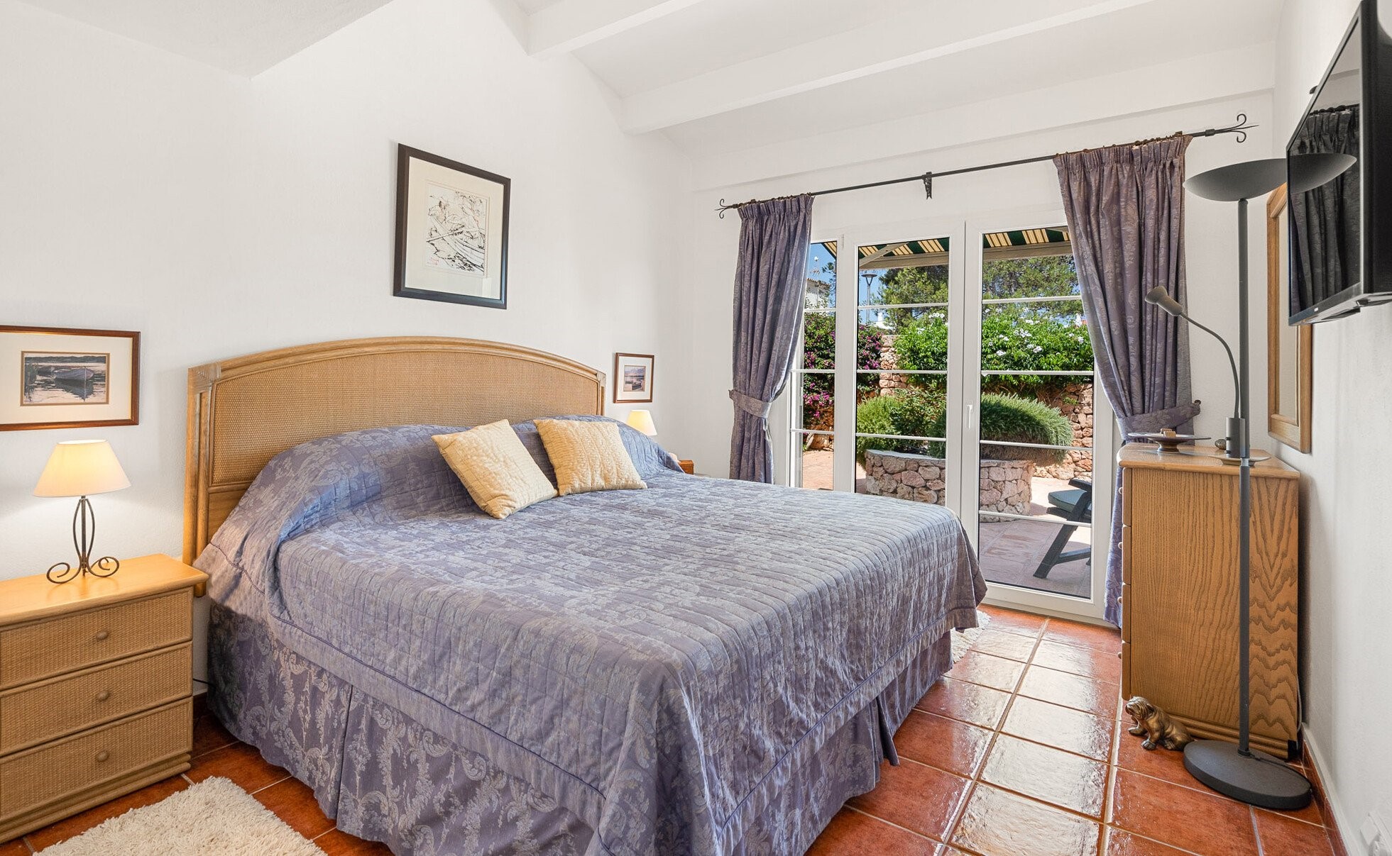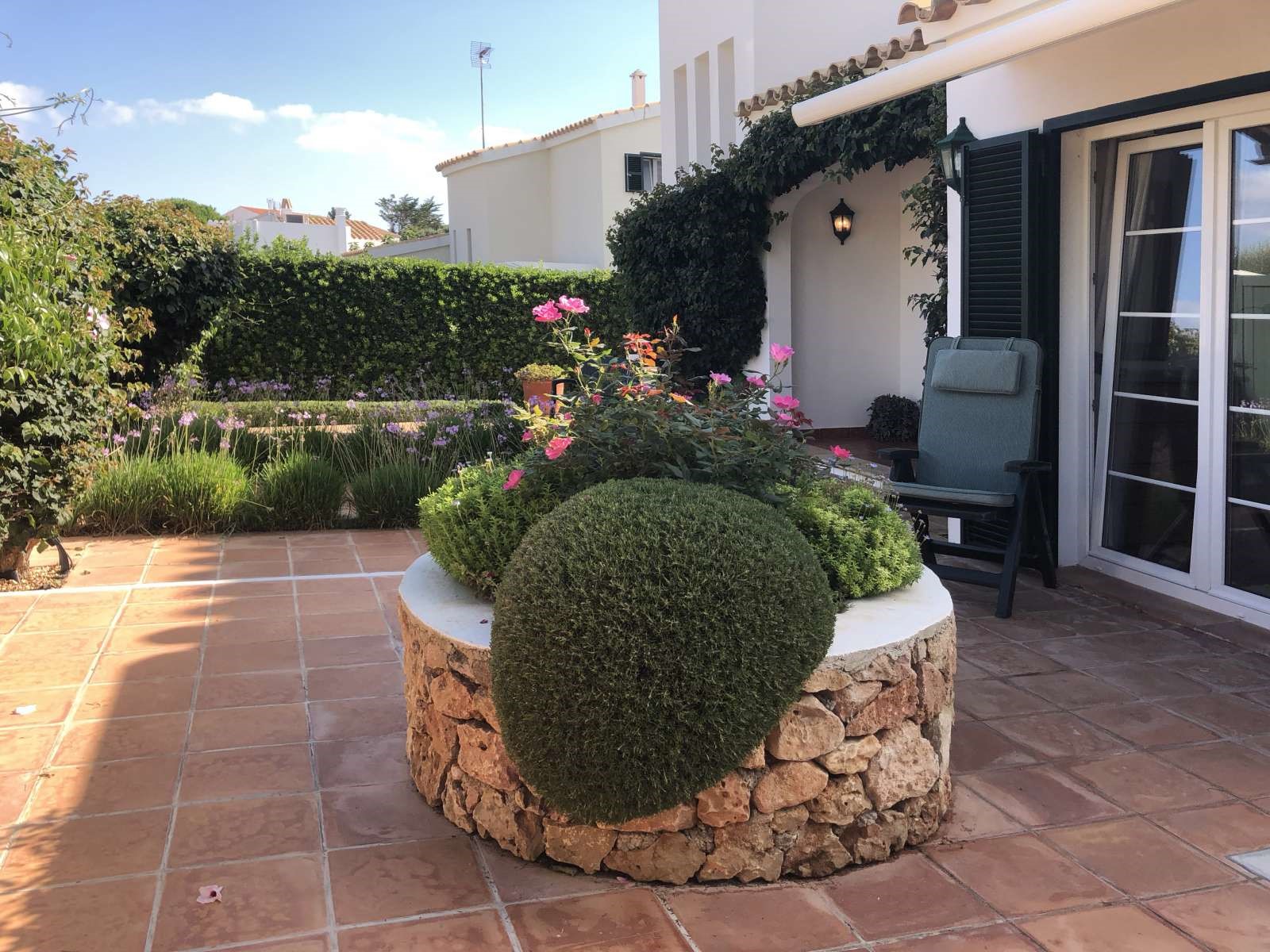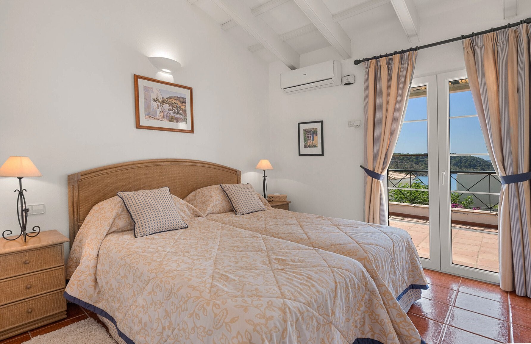 There are 4 generous bedrooms – 2 with Superking sized beds and 2 with continental twin beds that can be linked to provide 2 further Superking sized beds with 2 quality duck down pillows per person. The extremely comfortable beds, the pillows and bedlinen all came from the UK. The 3 bedrooms upstairs open on to the Sun Terrace. The 4th bedroom downstairs opens on to the pretty courtyard gardens. There is room for a cot in bedroom 3 upstairs. The totally versatile sleeping accommodation is ideal for siblings who may require separate bedrooms, grandparents who like privacy and also for those who may have limited mobility.