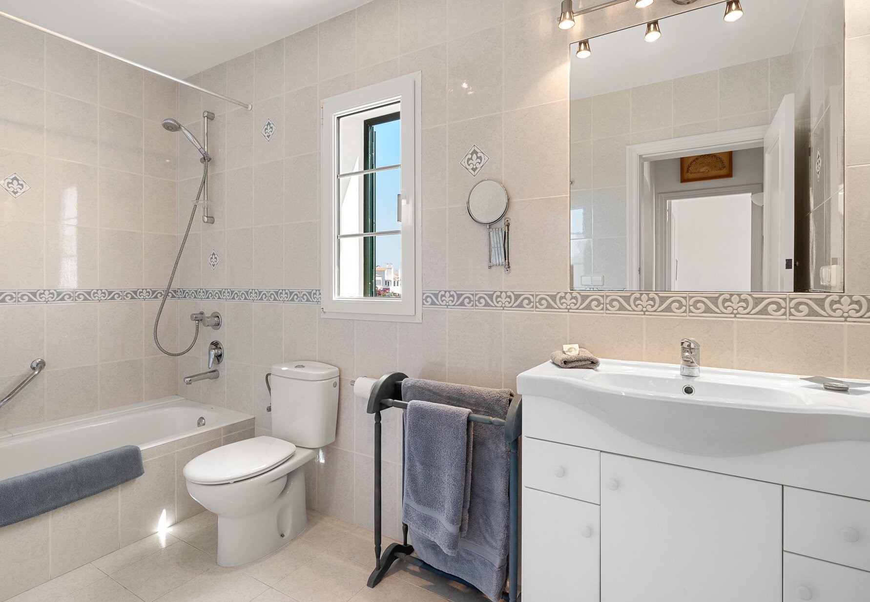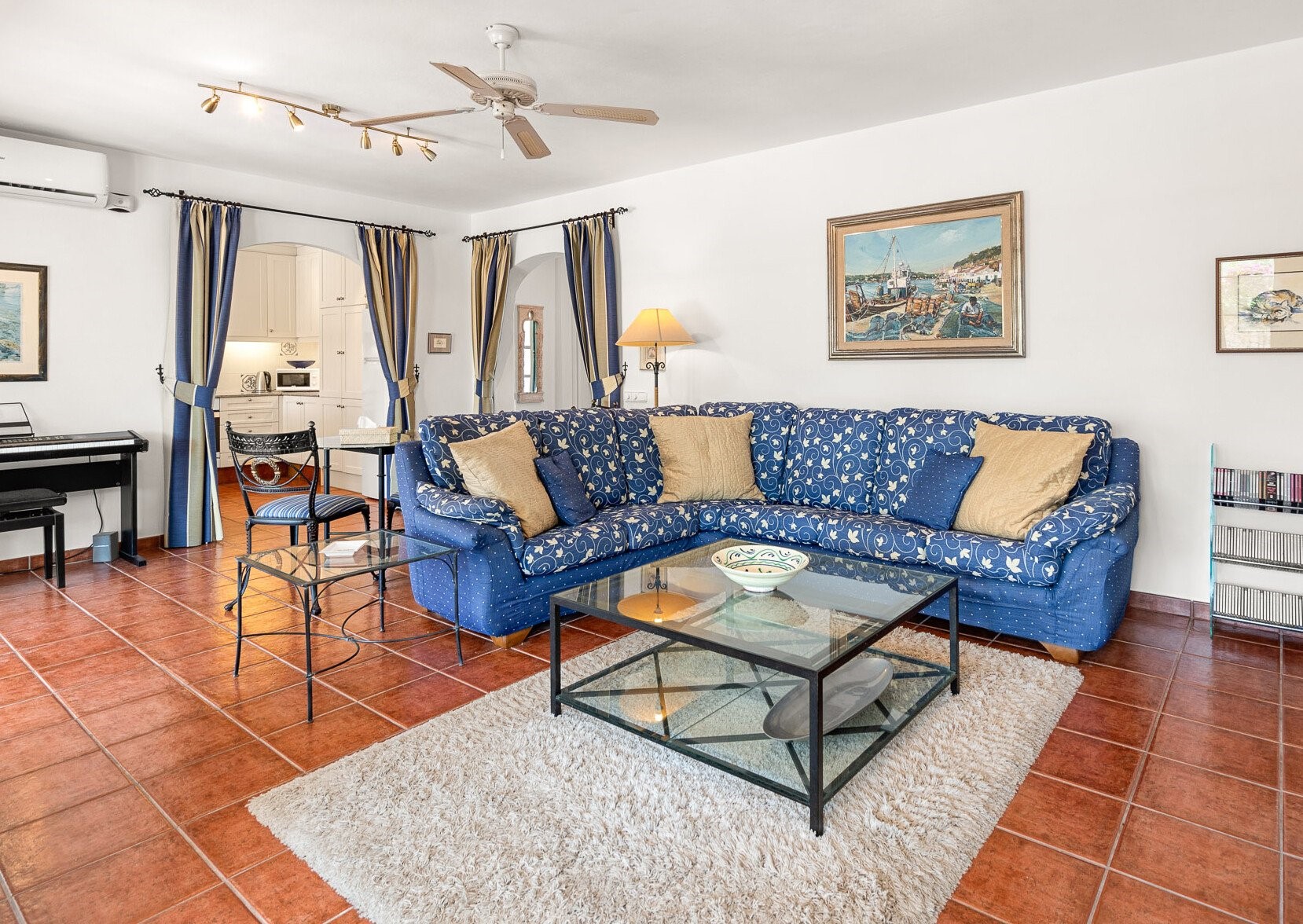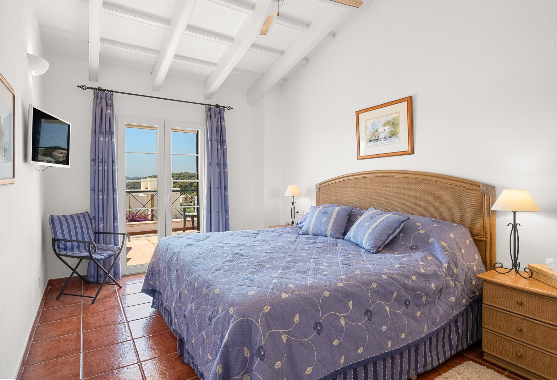 There are 4 generous bedrooms – 2 with Superking sized beds and 2 with continental twin beds that can be linked to provide 2 further Superking sized beds with 2 quality duck down pillows per person. The extremely comfortable beds, the pillows and bedlinen all came from the UK. The 3 bedrooms upstairs open on to the Sun Terrace. The 4th bedroom downstairs opens on to the pretty courtyard gardens. There is room for a cot in bedroom 3 upstairs. The totally versatile sleeping accommodation is ideal for siblings who may require separate bedrooms, grandparents who like privacy and also for those who may have limited mobility.