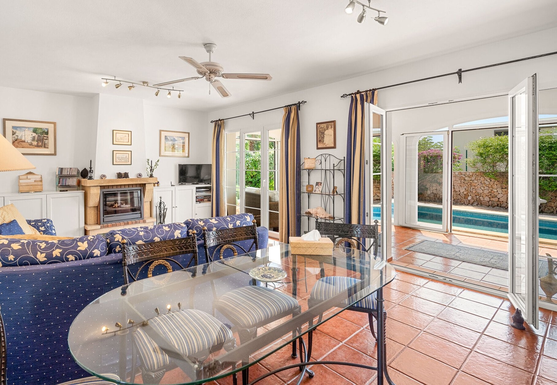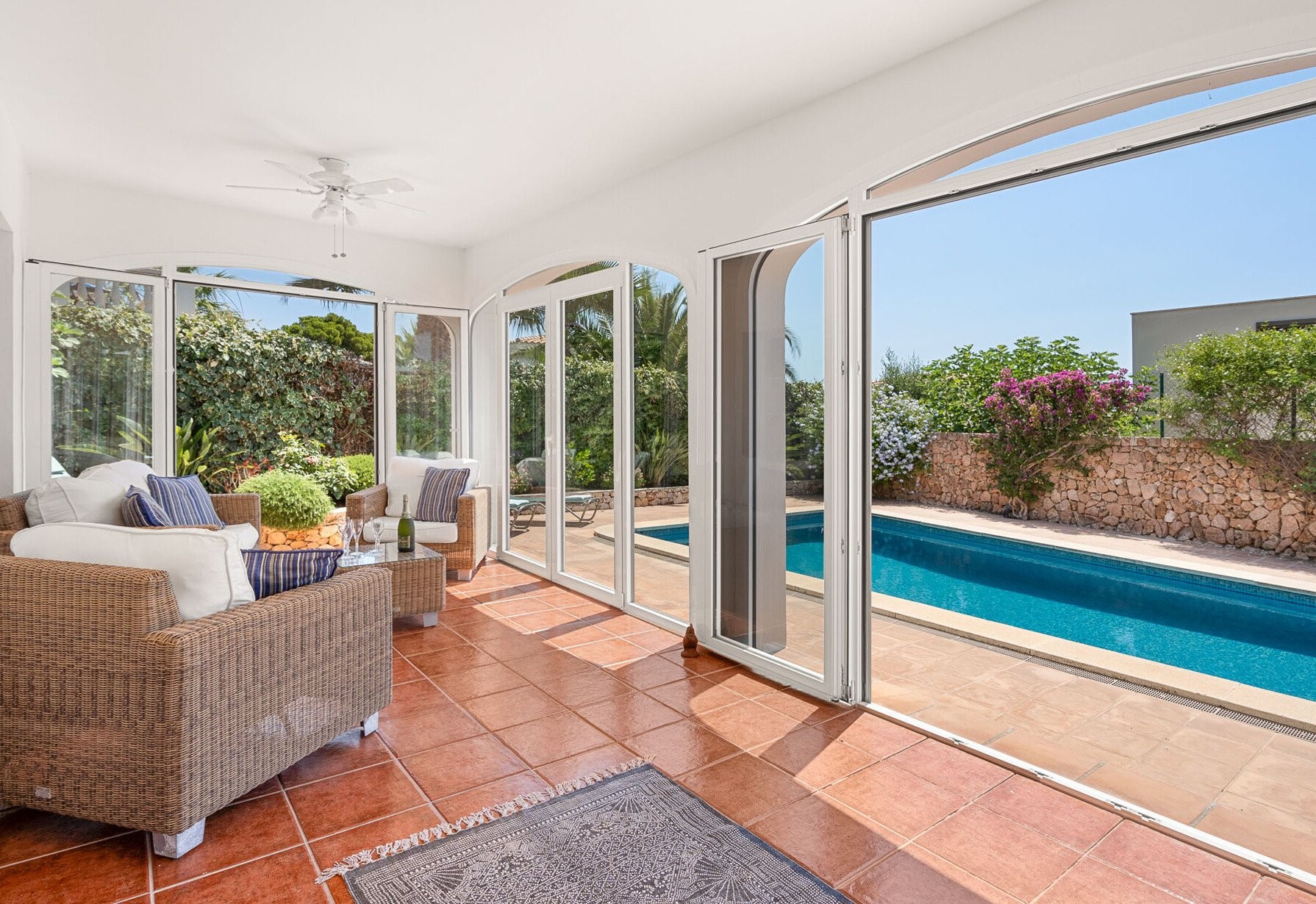 GARDEN ROOM – This room adjoins the open plan Living, Dining and Kitchen areas. It has 5 sets of bi-fold doors, 2 ceiling fans a teak dining table and cushioned chairs to seat up to 10. This spacious sunny area overlooks the pool and gardens. It has a big built in BBQ and servery together with a lovely suite of rattan furniture where you can chill out with a good book or enjoy drinks together before dining in or out as the mood takes you.