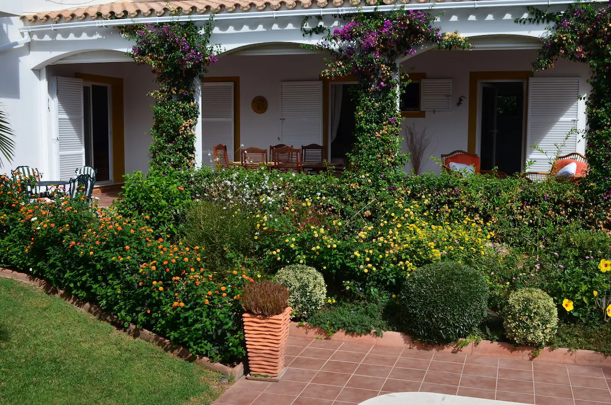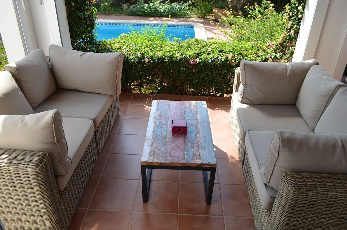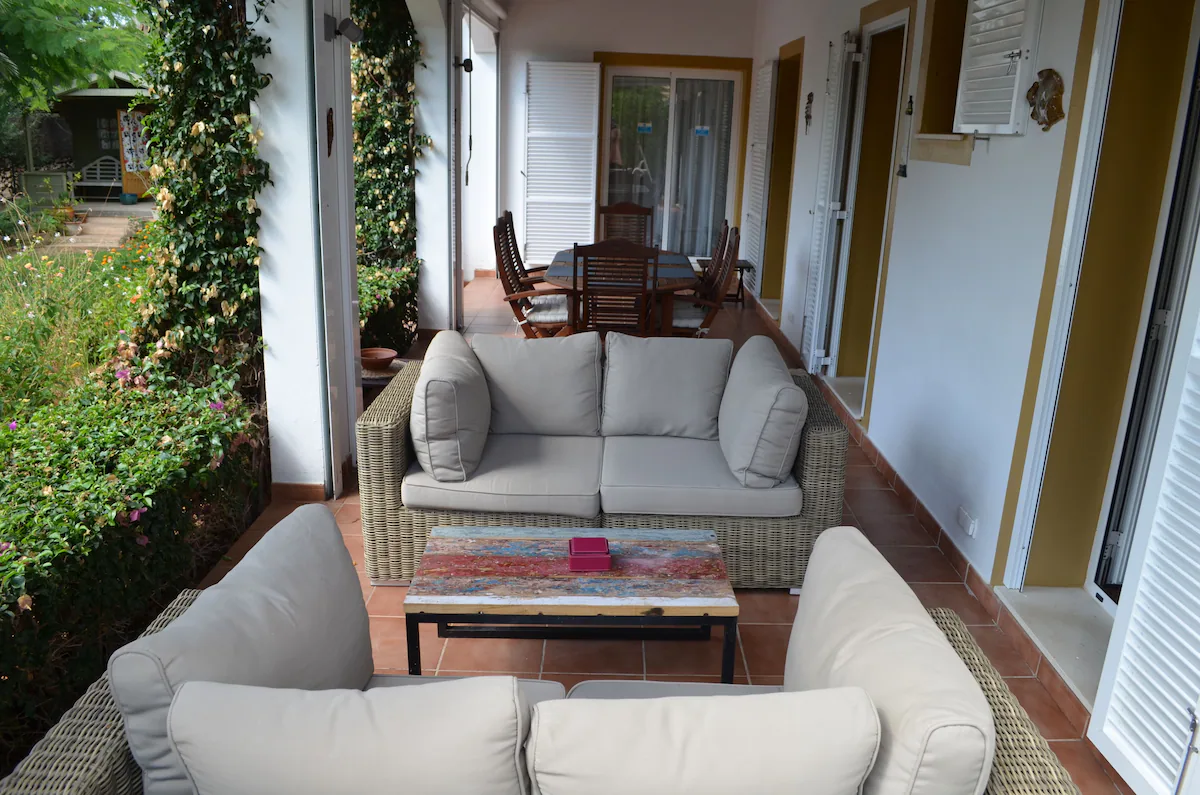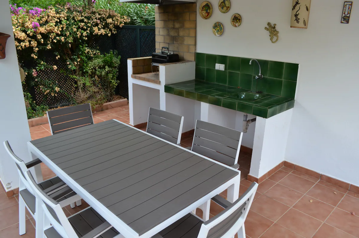 Outside the property is a large covered terrace area, accessible from both downstairs bedrooms, lounge and kitchen which you access through patio doors, thus providing shade all day. There is a dining table and chairs under the terrace, which seats 6, to be able to enjoy al-fresco dining. There are also 2 comfy sofas to relax and take in the villa’s gardens and unwind.