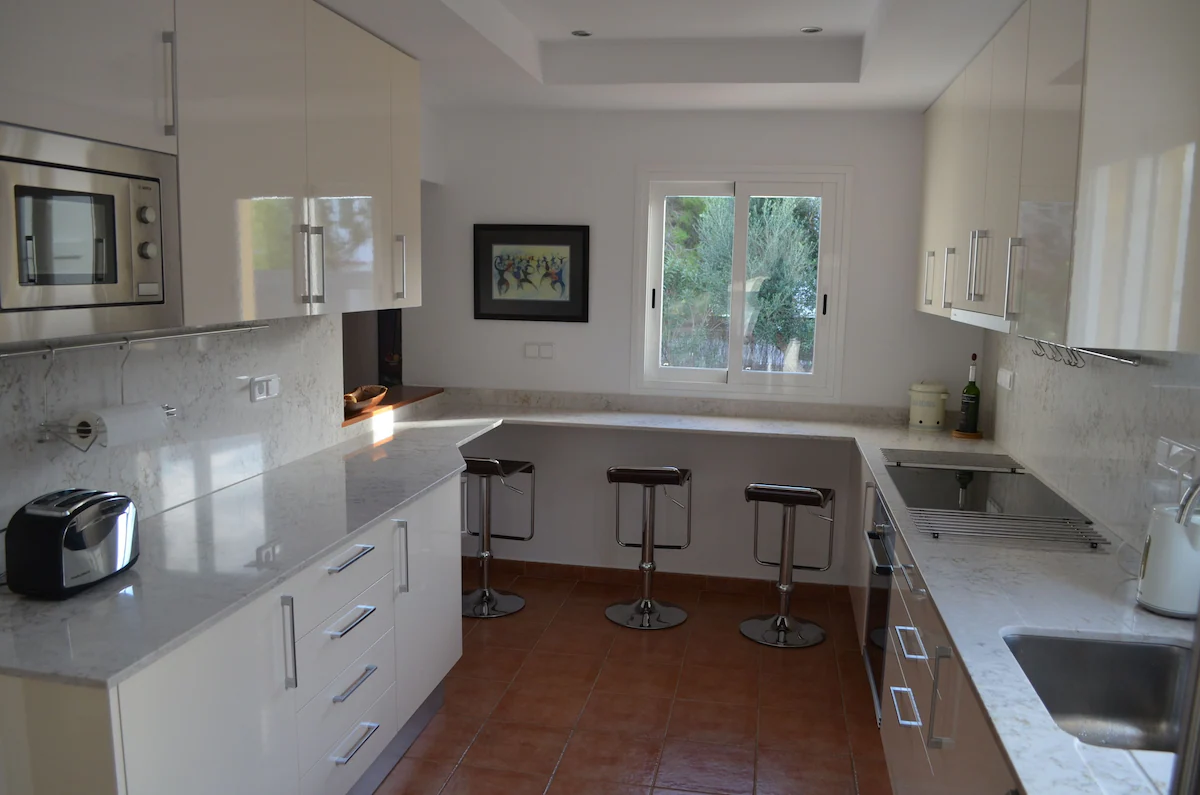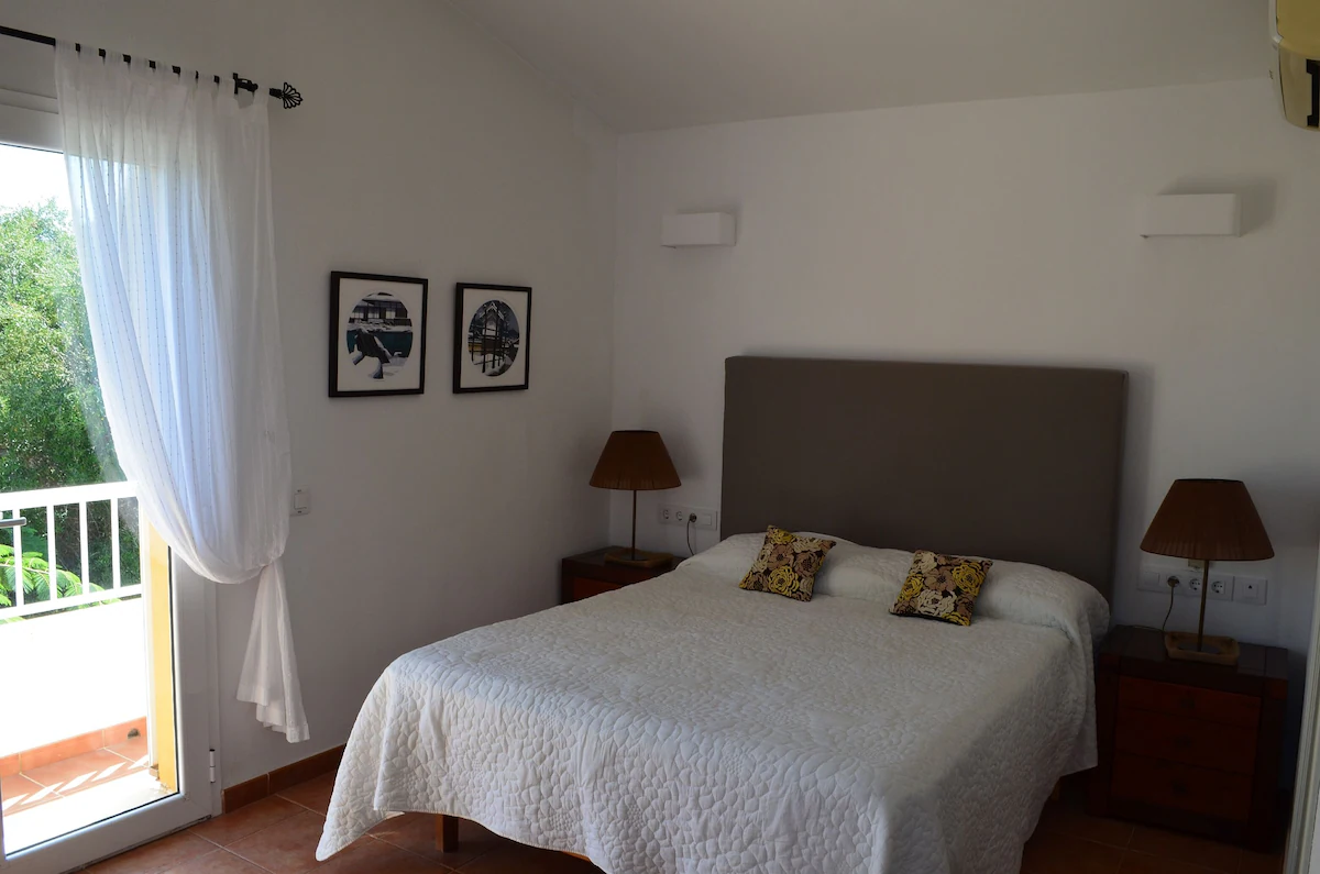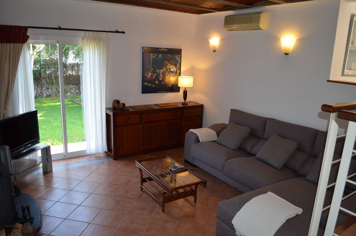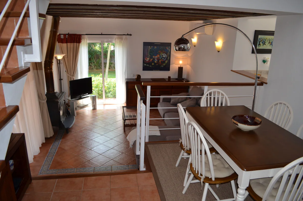 On arrival at the villa, the hallway leads down to into a dining area with a table and chairs for 6 people. A step down leads to the large living area with sofa, DVD player, flat-screen TV which has satellite English freeview channels. There is also a traditional wood fire, ideal for the cooler months of the season.
