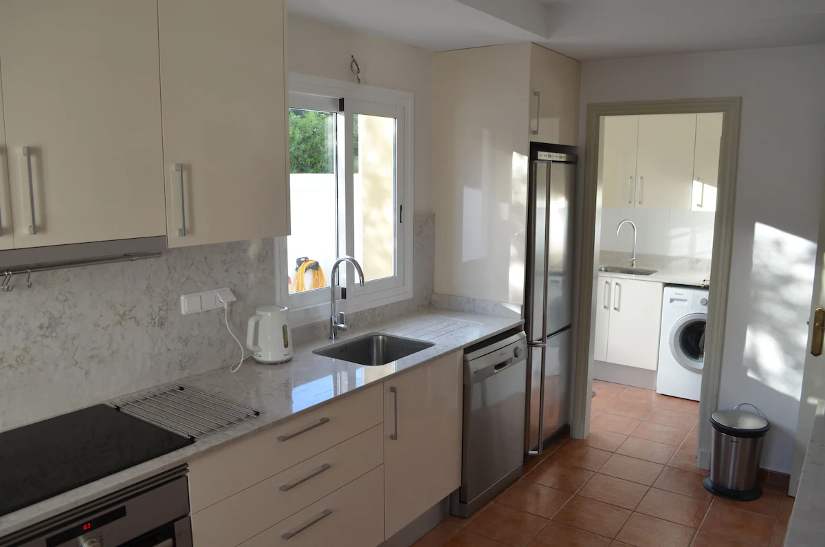 From the dining area is the kitchen with fitted units and marble-topped work surfaces. It has a gas hob and integrated oven, large fridge-freezer, dishwasher, microwave oven and all the crockery, cutlery and utensils necessary for a self-catering holiday. There is also a breakfast bar with 3 stools. Off the kitchen is a handy utility room containing a rinser, washing machine and dryer.