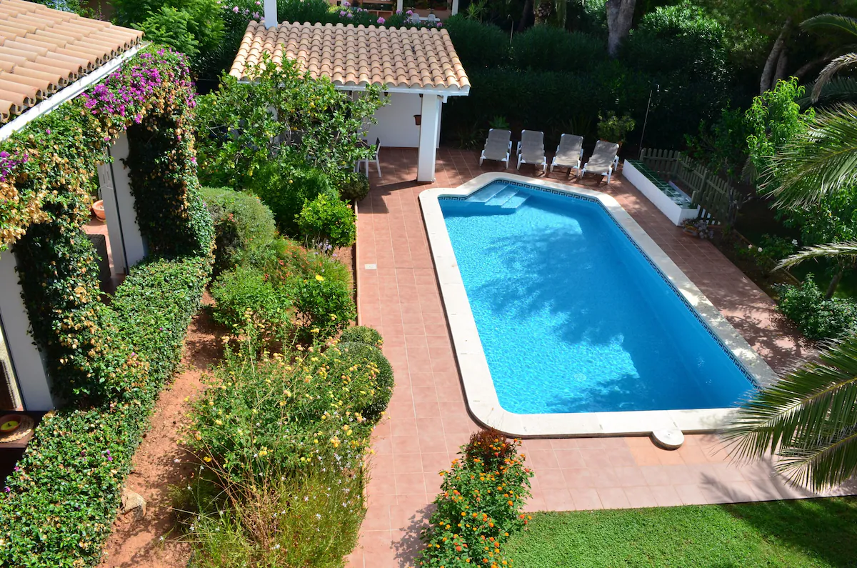 Down the steps from the terrace is the swimming pool (8m x 4m) with Roman steps access. There is plenty of space around the pool for sunbathing. There is also a brick built barbecue under another covered terrace as well as a further dining table and seating area.