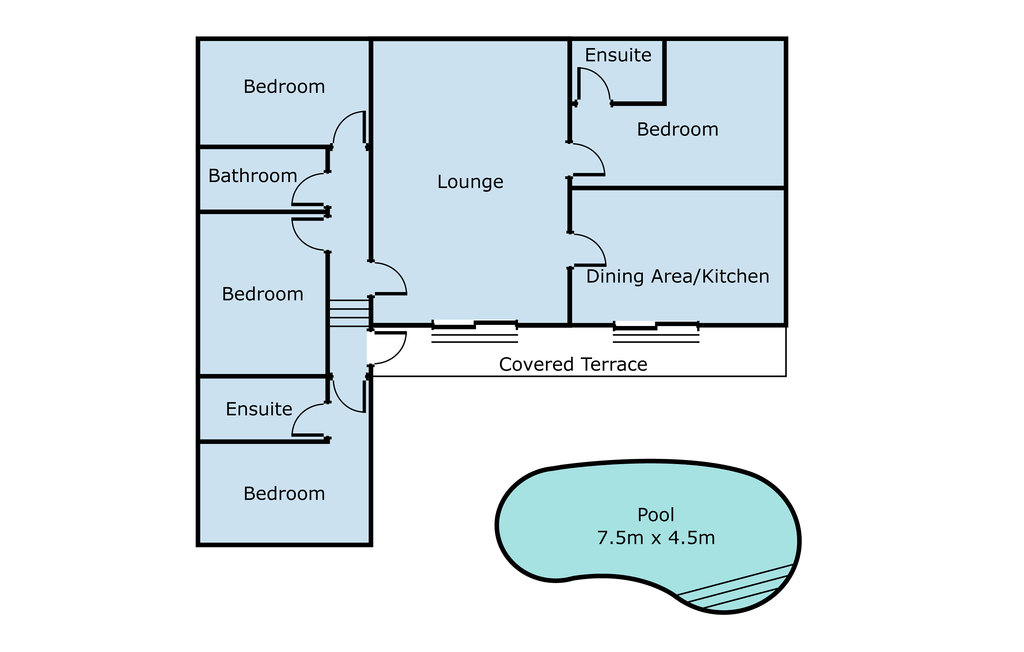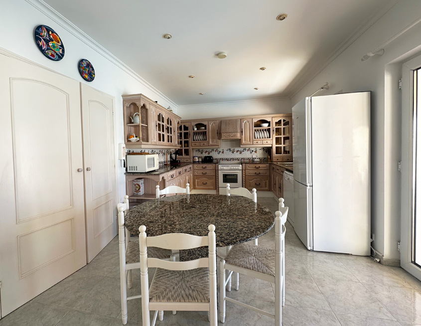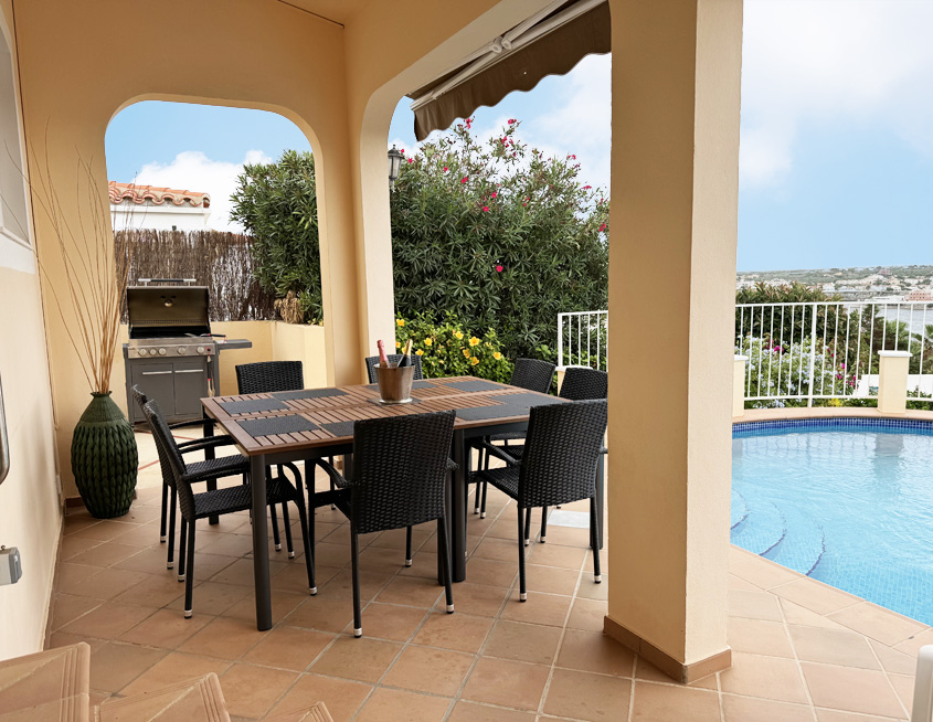 Outside there is a kidney-shaped private pool with roman-step access, approximately 7.5mx4.5m and with depth ranging between 0.95m and 1.7m. Around the pool terrace (which has retractable sunshades) there are dining tables and chairs to seat eight, as well as sun loungers and a large gas barbecue.