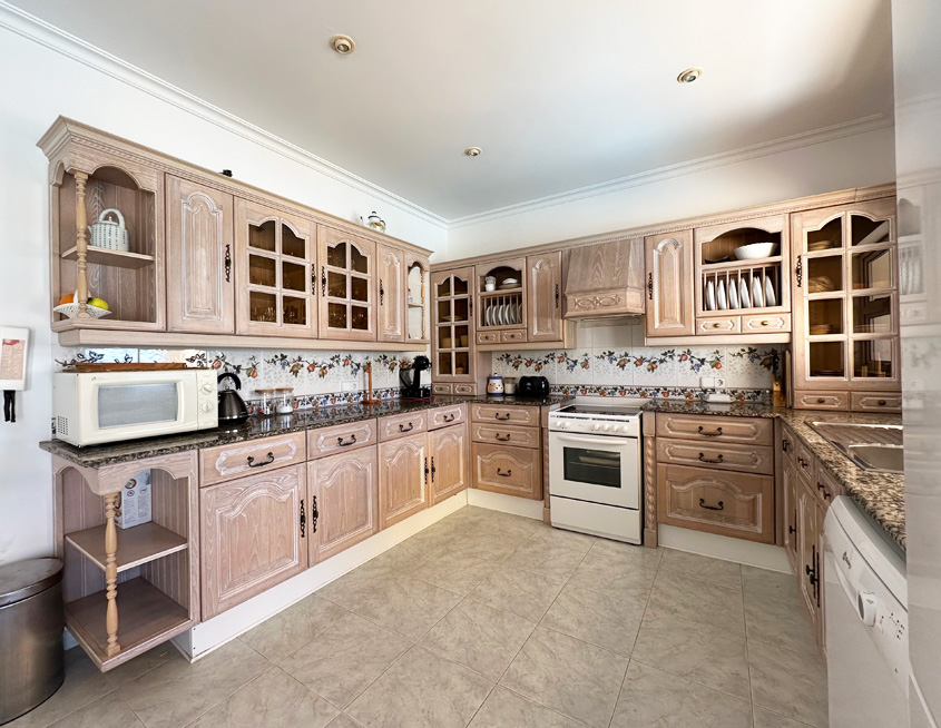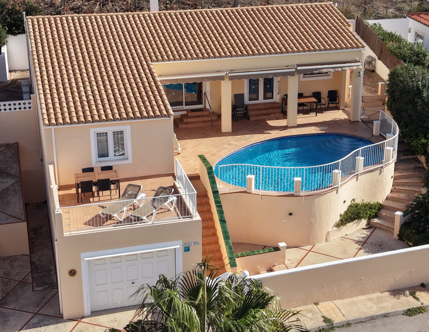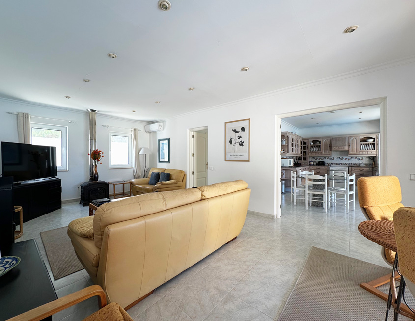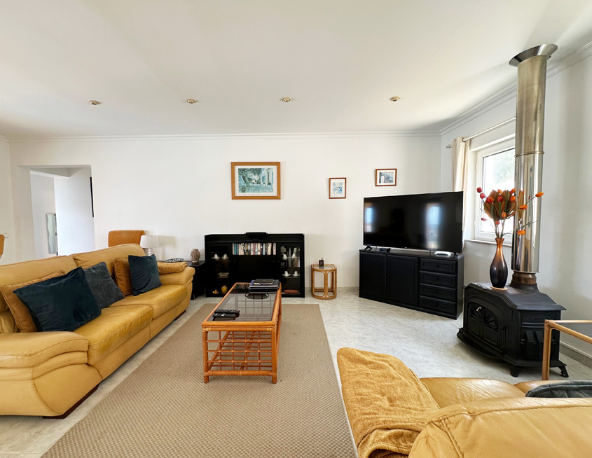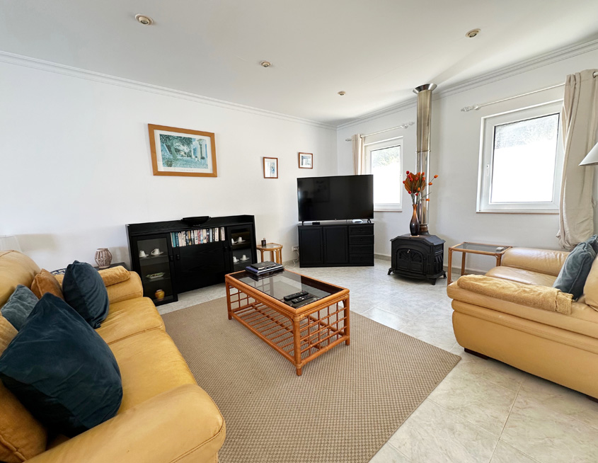 Rosa is laid out over one floor; there are a dozen or so steps up to the entrance from the road. Patio doors from the pool terrace lead you into the bright and airy house, where you will find a large and comfortably furnished living room with air-conditioning, armchair and sofa and recently installed 55-inch flatscreen SMART TV (not the one pictured!) on which you can watch a number of English channels via the broadband wifi internet.